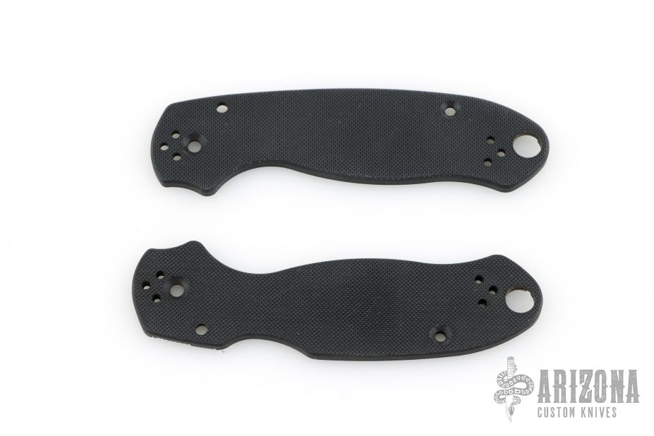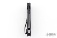 Handle: Peel ply textured, chamfered black G10 scales house inset skeletonized stainless liners, one forming the Compression Lock mechanism. A generous palm swell, index groove and pinky hook offer comfortable ergonomics and a secure grip for most users.