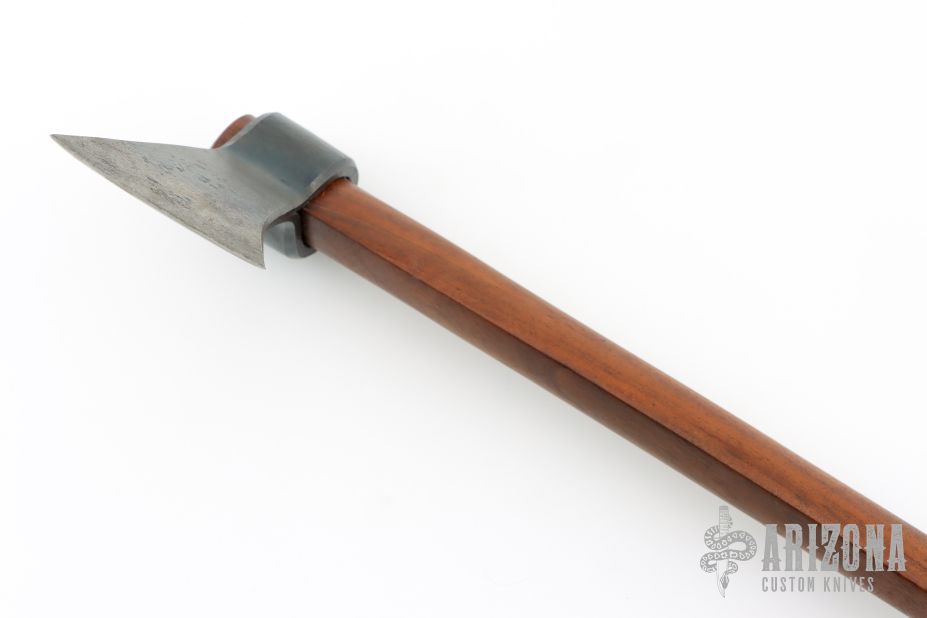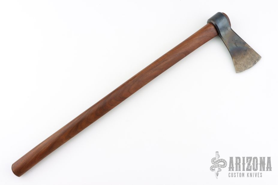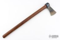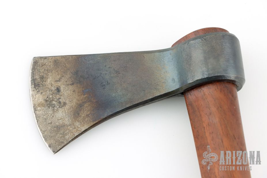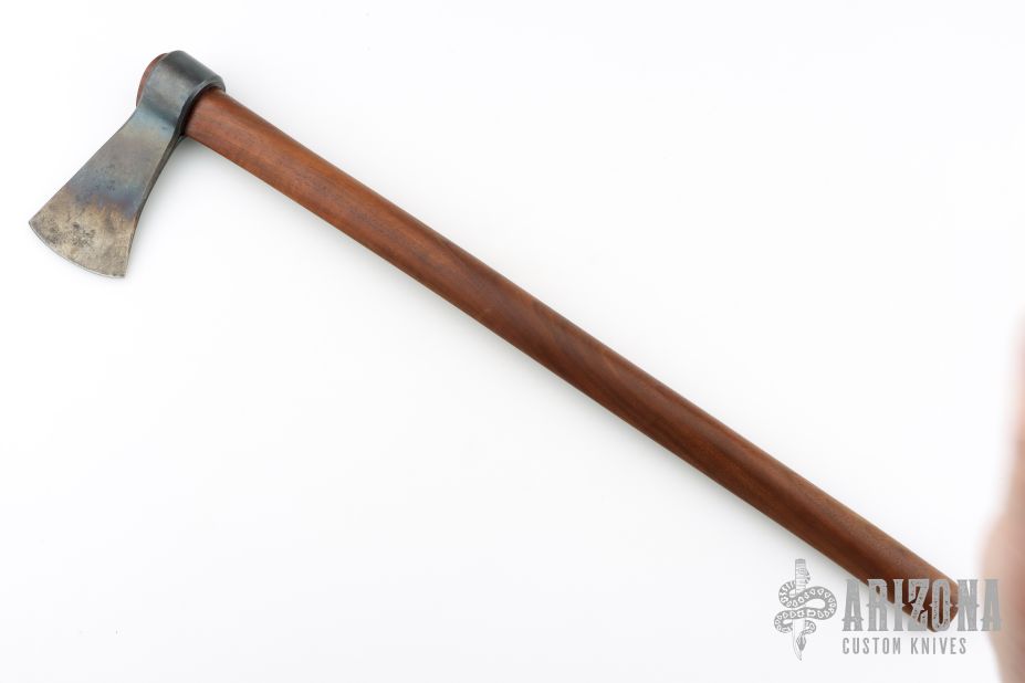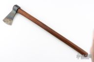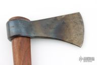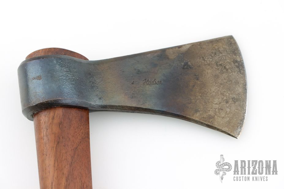 This forged tomahawk by Master Smith Robbin C Hudson features a forged carbon steel blade with a 2.625" blade edge and a 5.25" head. Has a dark wood grip (hickory?). Excellent condition.