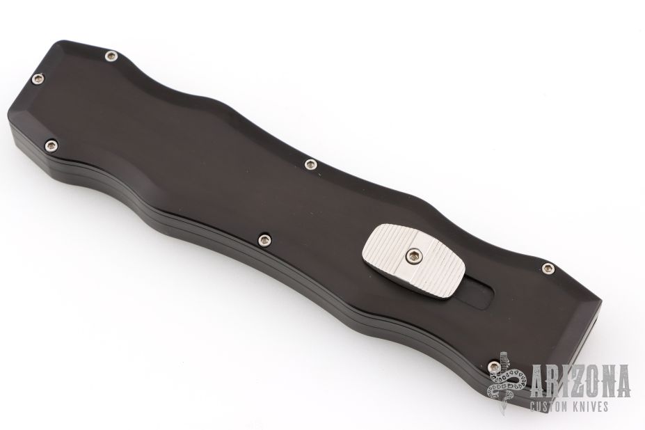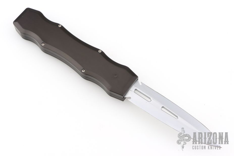This Sand Shark OTF automatic features a silver finished double edge blade and a black aluminum handle. The Sand Shark was a limited production and is no longer being made. Excellent condition. Comes with original box.