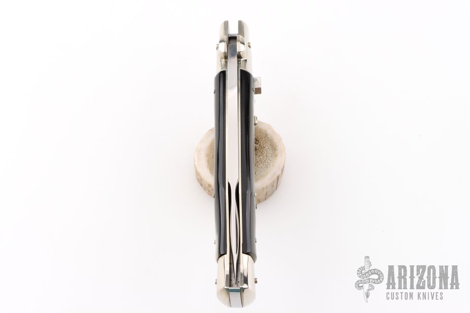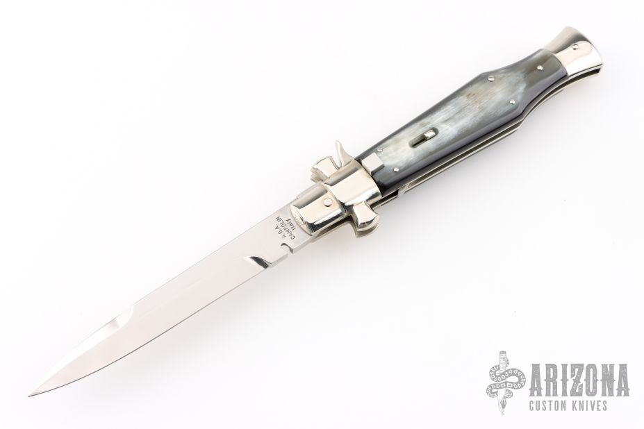 AGA Campolin 11" Blackwidow with black wood! This Campolin made automatic knife has solid nickel silver bolsters with maltese cross in the hilt. To close this one you use the lock back release at rear of the handle. This makes for very tight and stable construction and it's a bit more robust because of that. Has a mirror polished blade with false top edge. The nickel silver bolsters and liners, bufflo horn scales and a stainless steel backspacer. Includes a black leather sheath, COA and wooden presentation box.  Excellent Condition.