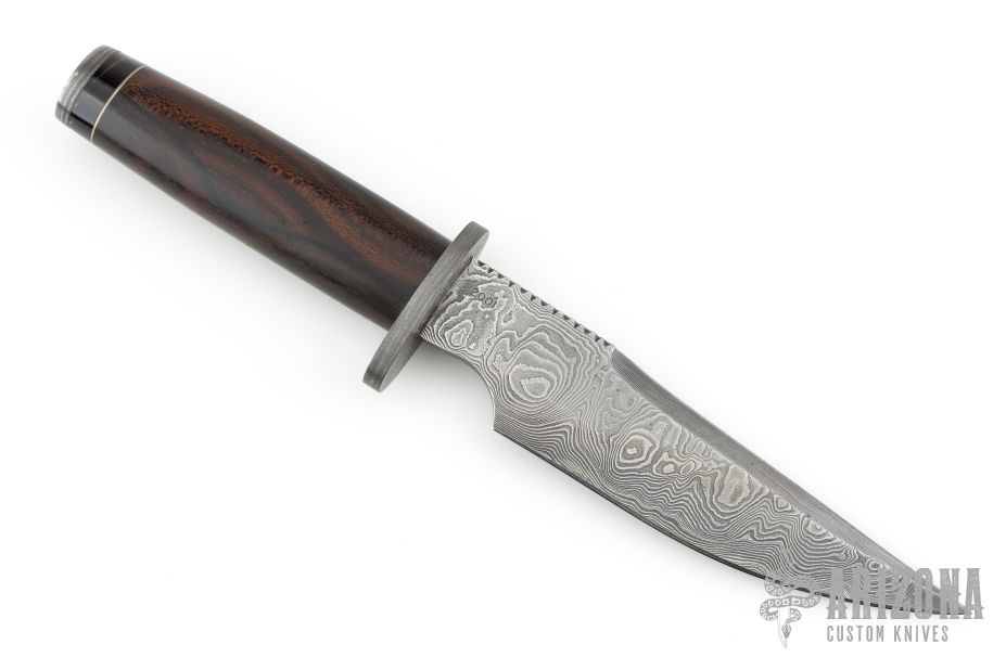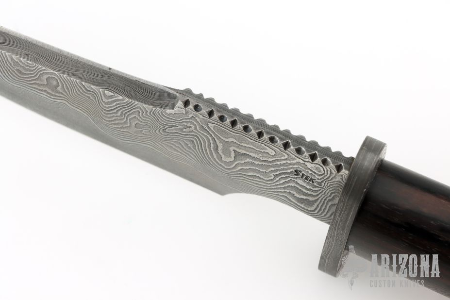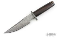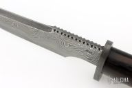 This Fighter from Stek Knives features a Damascus blade with a sharpened top edge and fileworked spine, .237" blade stock and 1.713" blade depth, hidden tang construction. The handle has a Damascus guard, dark wood grip, Damascus pommel, nickel silver and buffalo horn spacers. Includes a zippered case and dated 2001. Excellent condition.