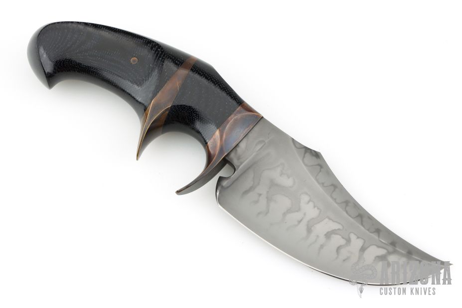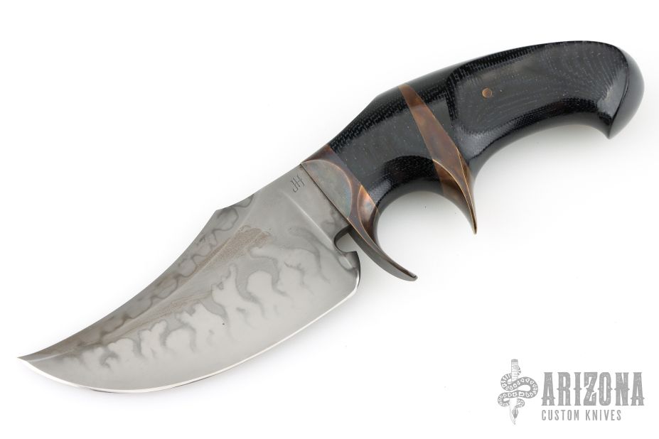 This Sub-Hilt Skinner by Jan Hafinec is beautiful. It features an upswept blade (C105 Carbon Steel) with amazing hamon and sharpened top edge, .218" blade stock and 1.854" blade depth, hidden tang construction. The handle has a bronze guard and sub-hilt with a black canvas micarta grip, bronze pin. Comes with a zippered case. Has a little oxidation on the blade, otherwise excellent condition.
