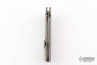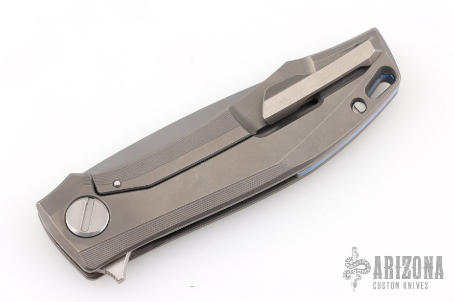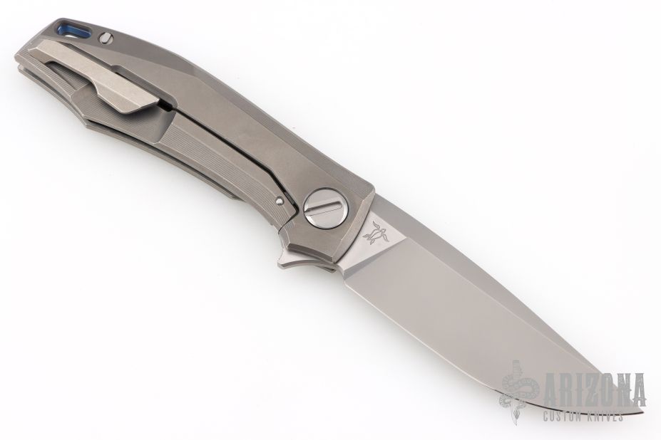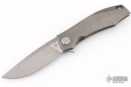 This RKMP by Shirogorov Knives is a Charles Marlowe design. It features a bead blast finished blade with, hand satin flats and flipper tab. The handle has a bead blast finished, milled titanium frame with two-tone blue anodized pin stripe titanium backspacer and bead blast finished tip up clip. Nice detent, lockup and blade seating. Has MRBS. Comes with original box, cloth, and COA. Has a couple light scuffs, excellent condition. #65/150
