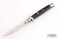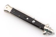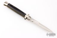 This swivel bolster auto by Latama features a bayonet blade with a false top edge. Nickle silver guard and rear bolster and buffalo horn scales, brass liners and stainless steel backspacer. Nice function, strong firing and lock up. Excellent condition.