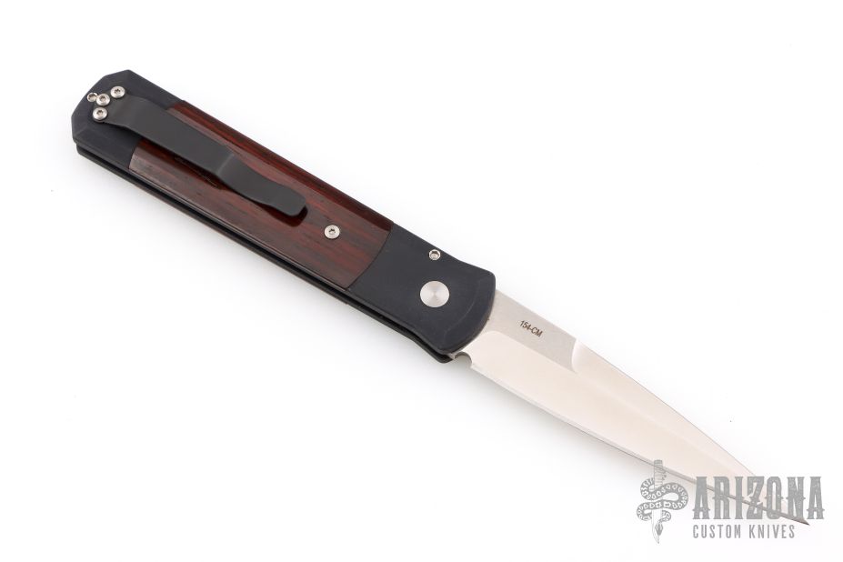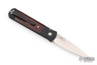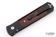 The Godfather 4" blade auto knife represents the influence of original Italian "Stilletto" style auto knife and Pro-Tech's modern coil spring precision. This Godfather has a satin finished blade and anodized black handle with cocobolo inlays. Black coated stainless steel clip. Comes with original box and papers. Excellent condition.