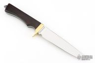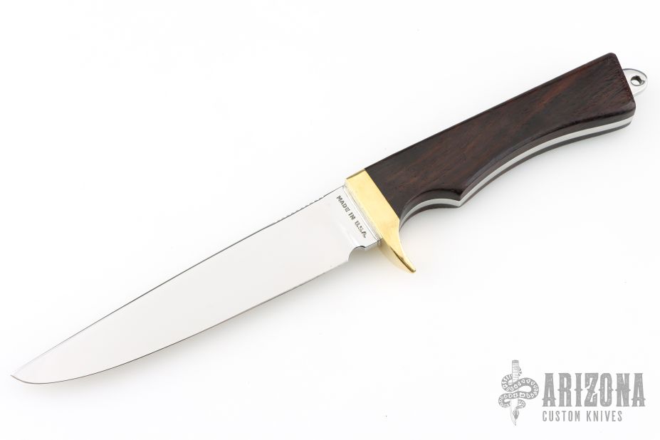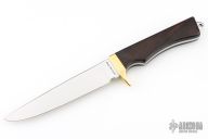 This Model 6050 Fisherman by Smith & Wesson features a polished drop point blade, notched thumb rest, .153" blade stock and 1.095" blade depth, hidden tang (3/4 hidden) construction. The handle is comprised of a brass guard, wood grip and lanyard hole in exposed tang in pommel. Excellent condition.