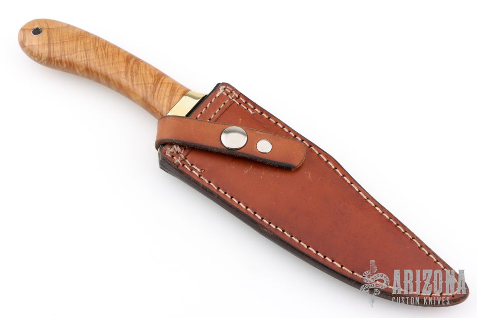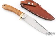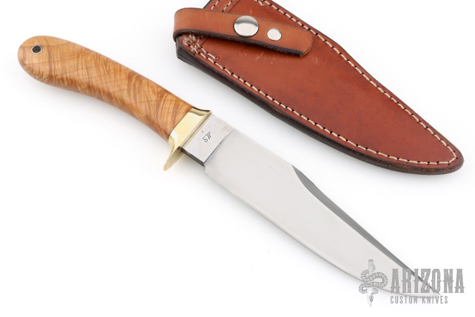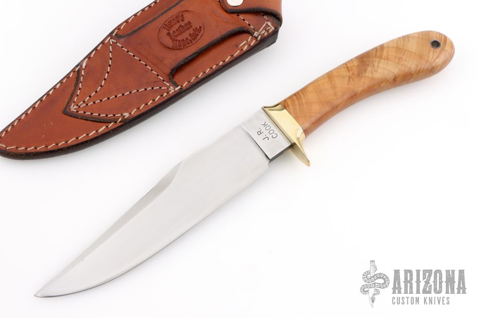 This Large Hunter by Master Smith James R Cook features a hand rub satin finished blade with a sharpened top edge, .229" blade stock, 1.460" blade depth, hidden tang construction. The handle has a brass guard, maple grip with a lanyard hole. Comes with a brown leather sheath by Rowe's Leather. Has some light scratches, good condition otherwise.