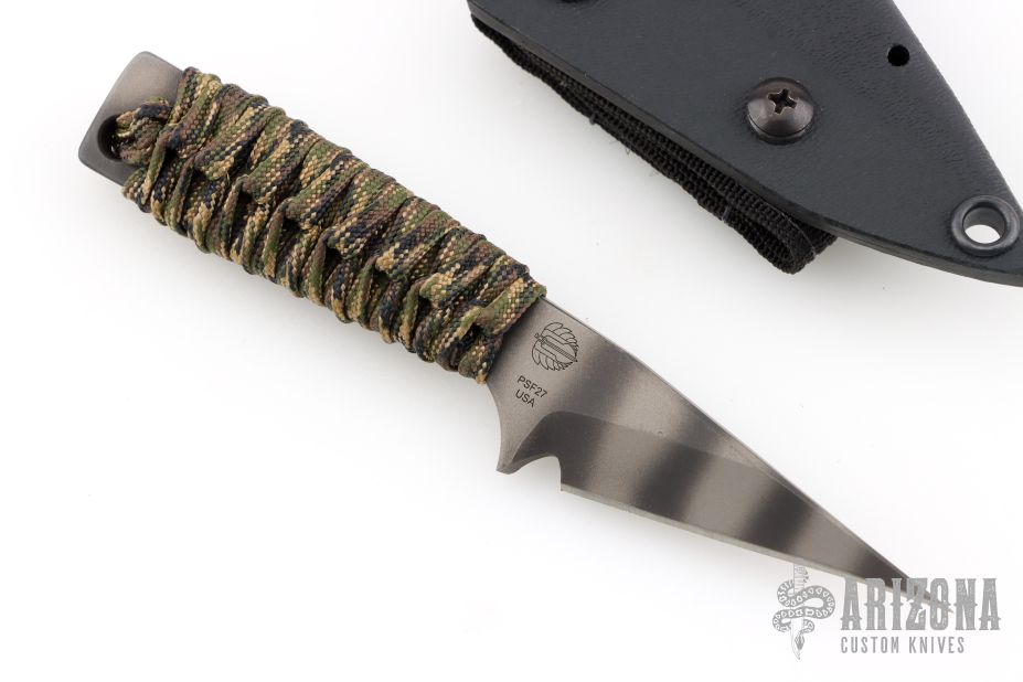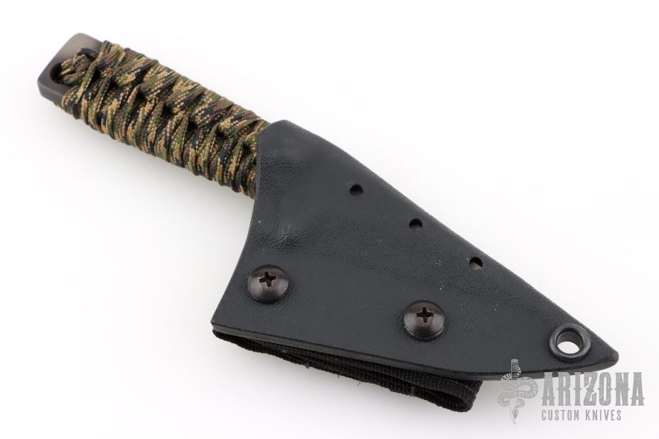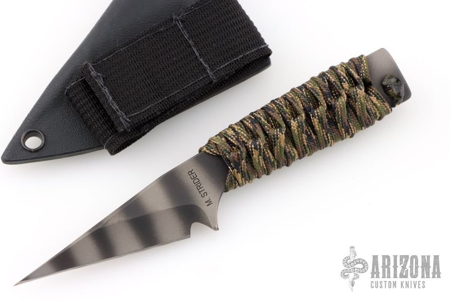 This knife by Mick Strider features a tiger striped blade with .227" blade stock and .955" blade depth, full tang construction. The handle has a cord-wrapped grip. Comes with a kydex sheath. Excellent condition.