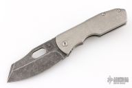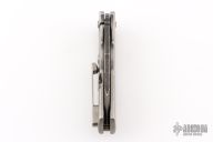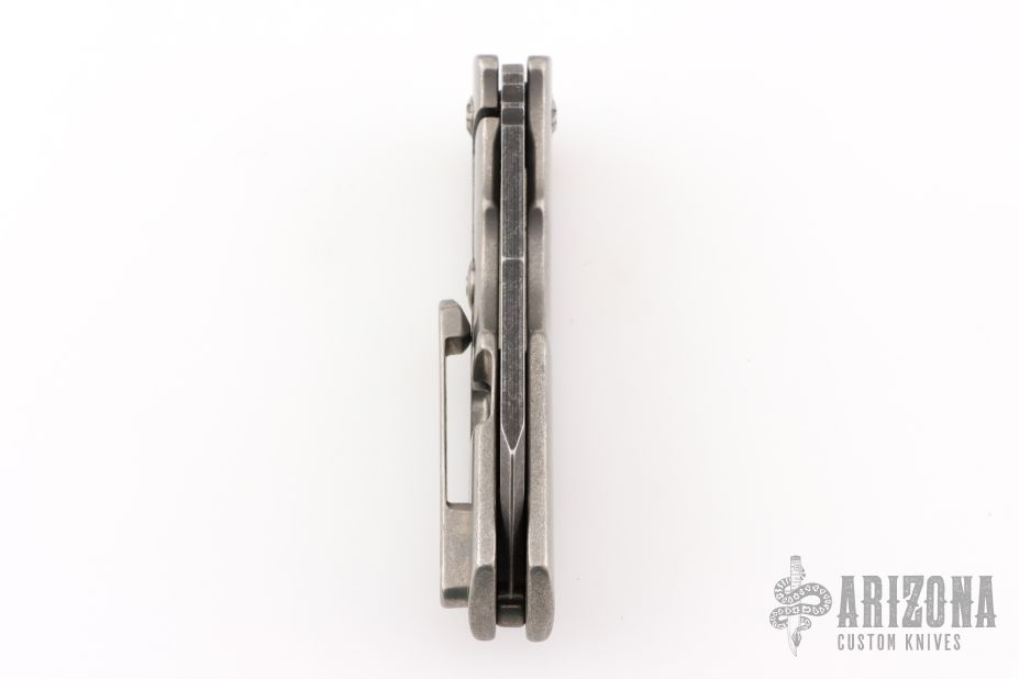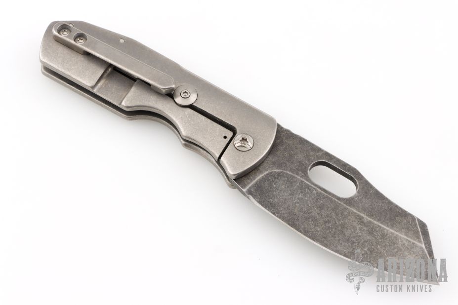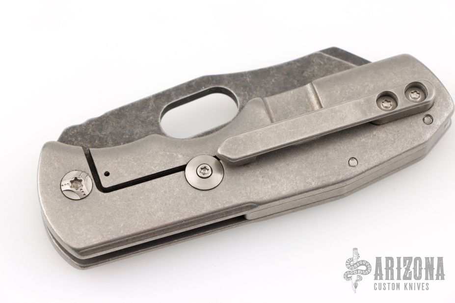 This Rogue Bench Series by Kingdom Armory features a hand ground dark tumble finished blade with thumbhole. The handle has a stonewashed titanium frame with tumbled titanium backspacer and tip up clip. Nice detent, lockup and blade seating. Comes with original box and papers. New from maker. New old stock from maker.