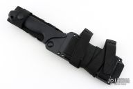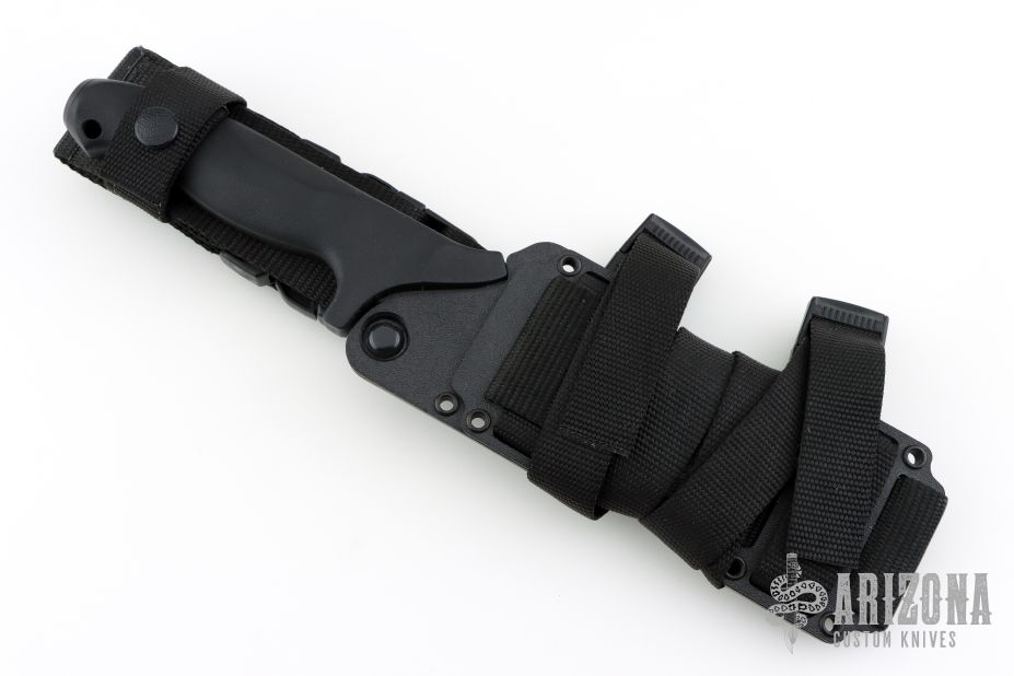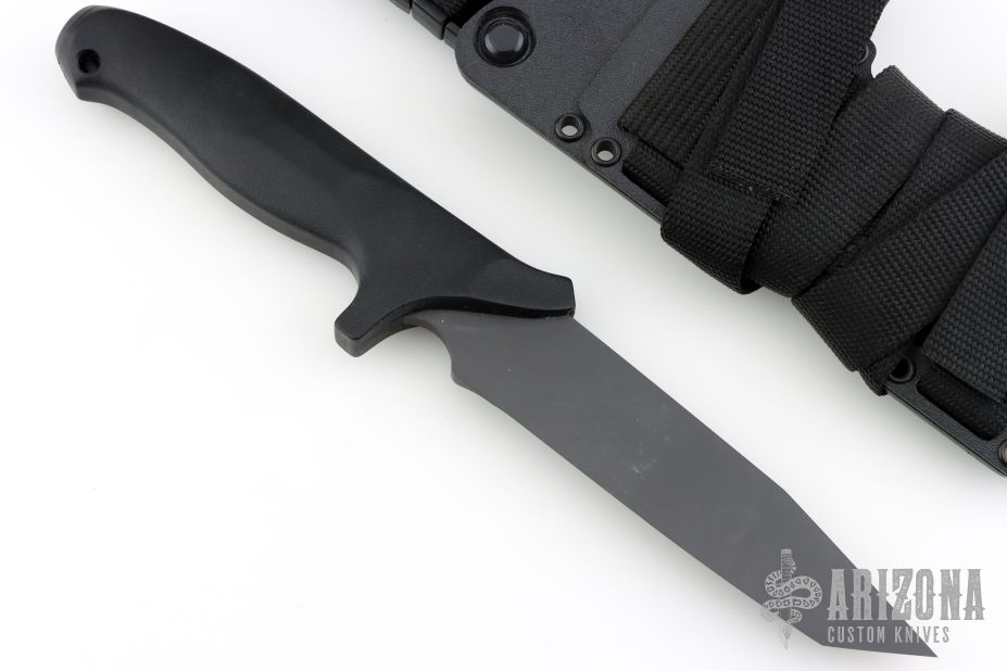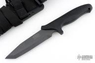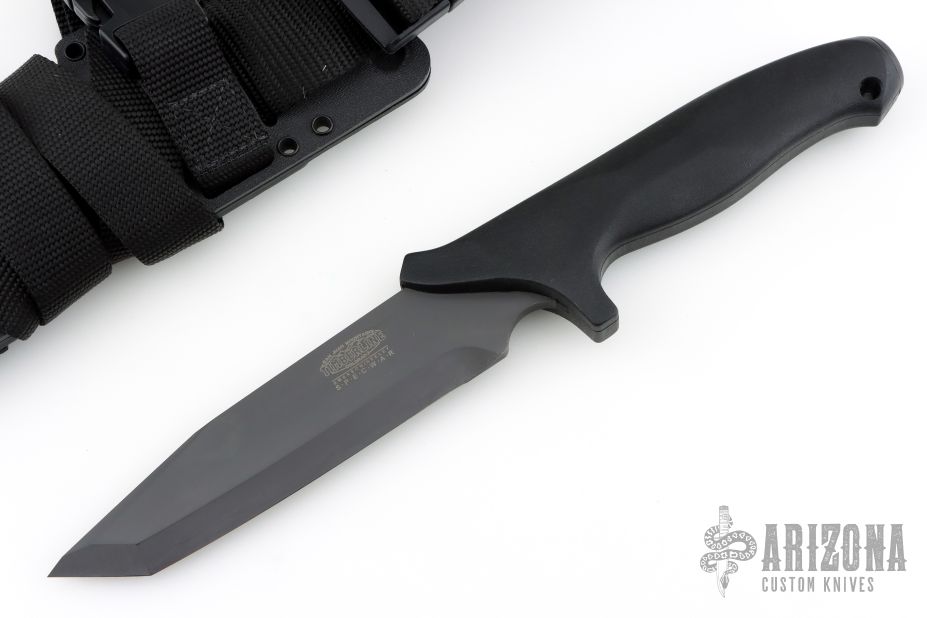 This Specwar Fixed Blade by Timberline Knives features a black  tanto chisel ground blade, @ 60 RC, 0.200" blade thickness and 1.385" blade depth. The handle is fiberglass reinforced nylon with a stainless steel butt plate for striking. Comes with original sheath. This collaboration between Ernie Emerson and Vaughn Neeley won "American Made Knife of the Year" at the 1995 Blade Show. Excellent condition. Hard to find. Has some light sheath marks.