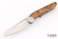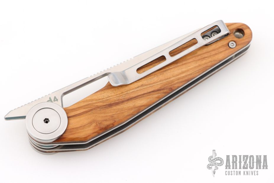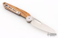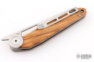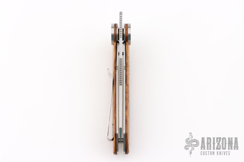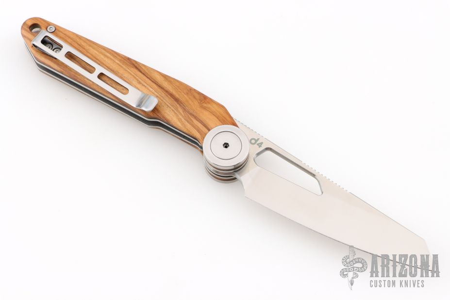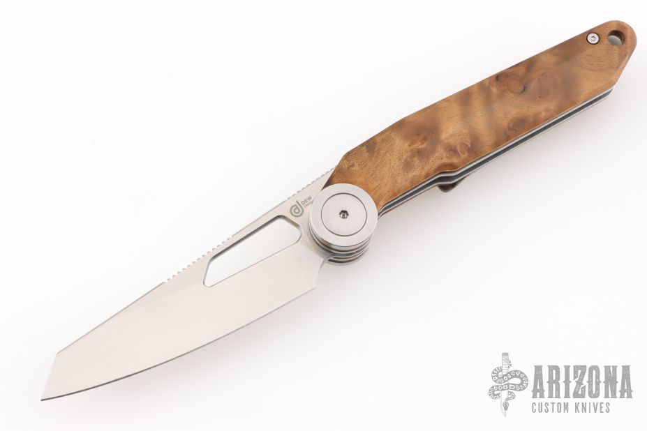 The D4 by Dew Hara Knives is not just a knife, but it is a work of art. Cut from shadow wood, its handle gives the knife an unique look. It is smooth and calls your attention. With two places on the blade spine with jimping, there is an opportunity to choke up on the blade when necessary for the particular task you are preforming. This knife has no blade play and a lanyard hole for your favorite lanyard. Use this as your next EDC knife!