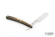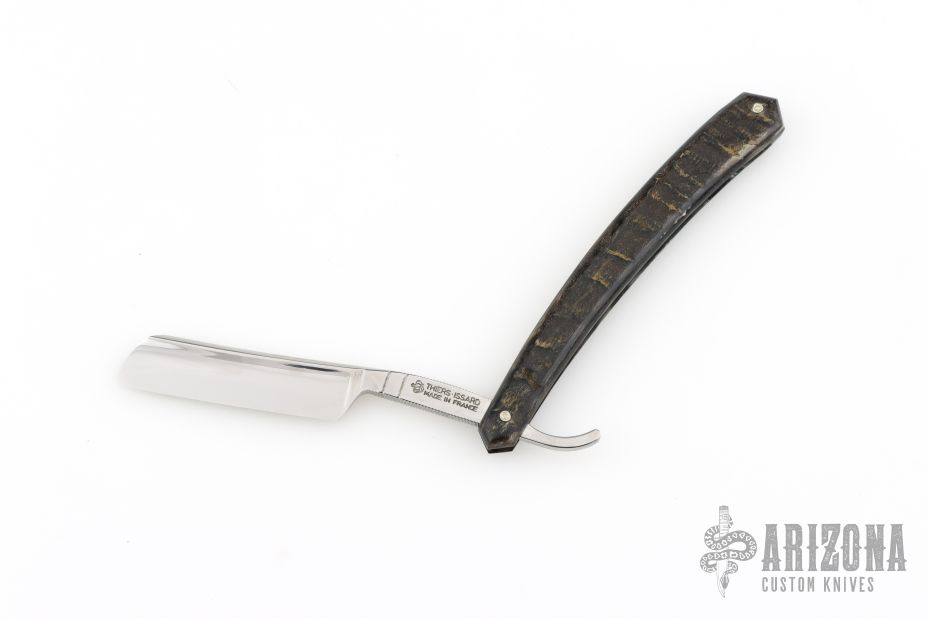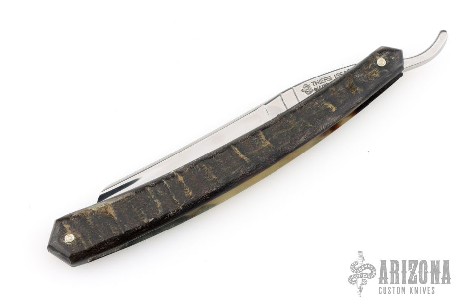 This Straight Razor by Thiers Issard features a hollow ground mirror polished blade with notched finger rests and a rams horn handle. Comes with original box, magnetic wooden display box and papers. Excellent condition. C135 Blade Steel.