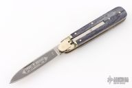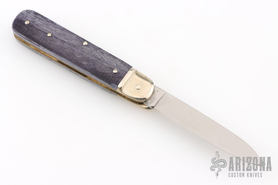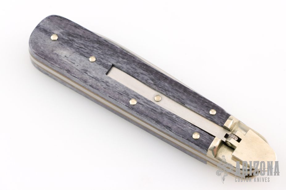 This Boker Leverlock features a drop point blade. The handle is comprised of nickel silver bolsters and dyed bone scales over brass liners and stainless steel backspring. Has some light scratches, excellent condition otherwise. Comes with original box and papers.