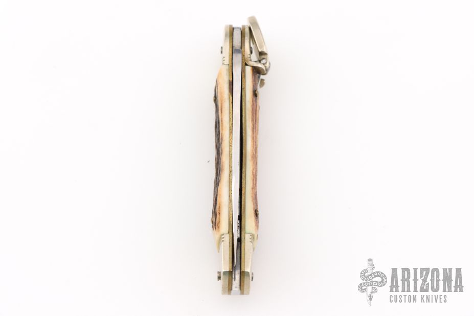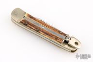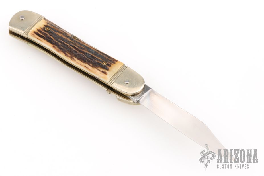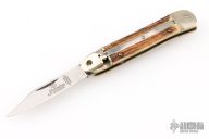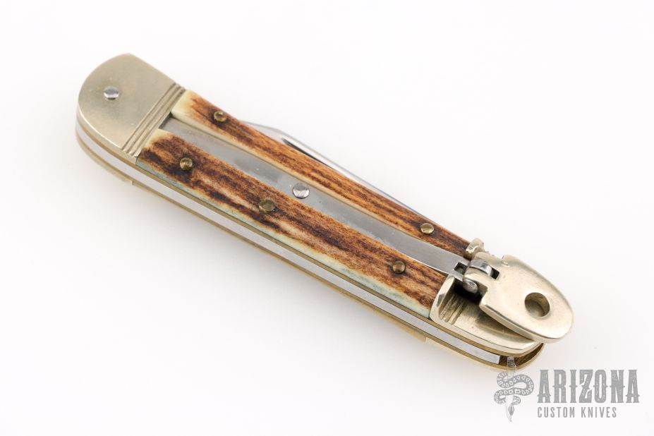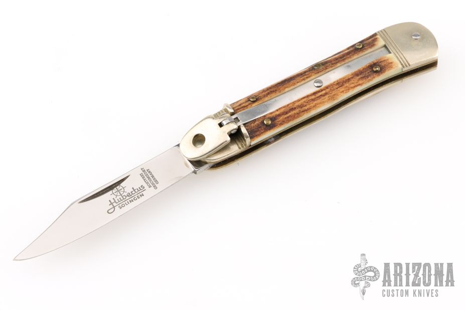 This leverlock auto by Hubertus features a mirror polished, clip point blade, nickel silver double bolsters, stag scales, brass liners and brass pins. Opens with a nice snap. Very fast opening. Has some light scratches, excellent condition otherwise.