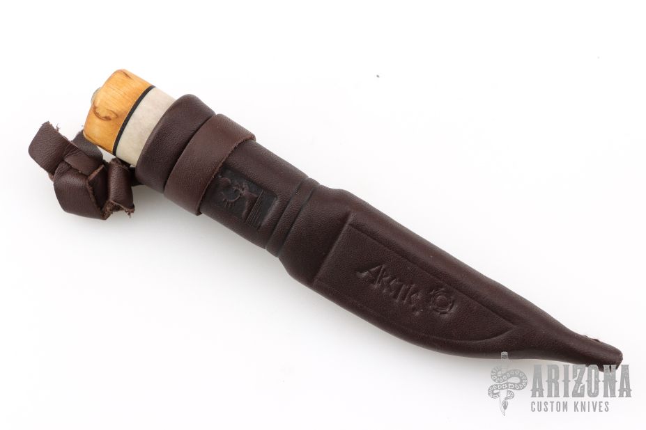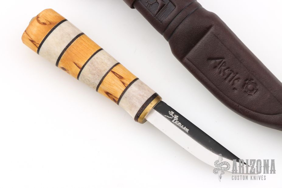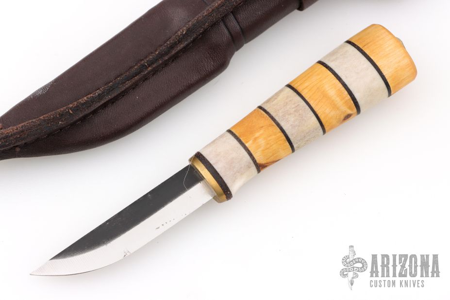 This knife by Kellam Knives features a two-tone blade, .082" Blade Depth .528" Blade Depth, hidden tang construction. The handle features a brass guard and a stacked bone/wood grip. Includes a brown leather sheath. Excellent condition.