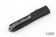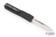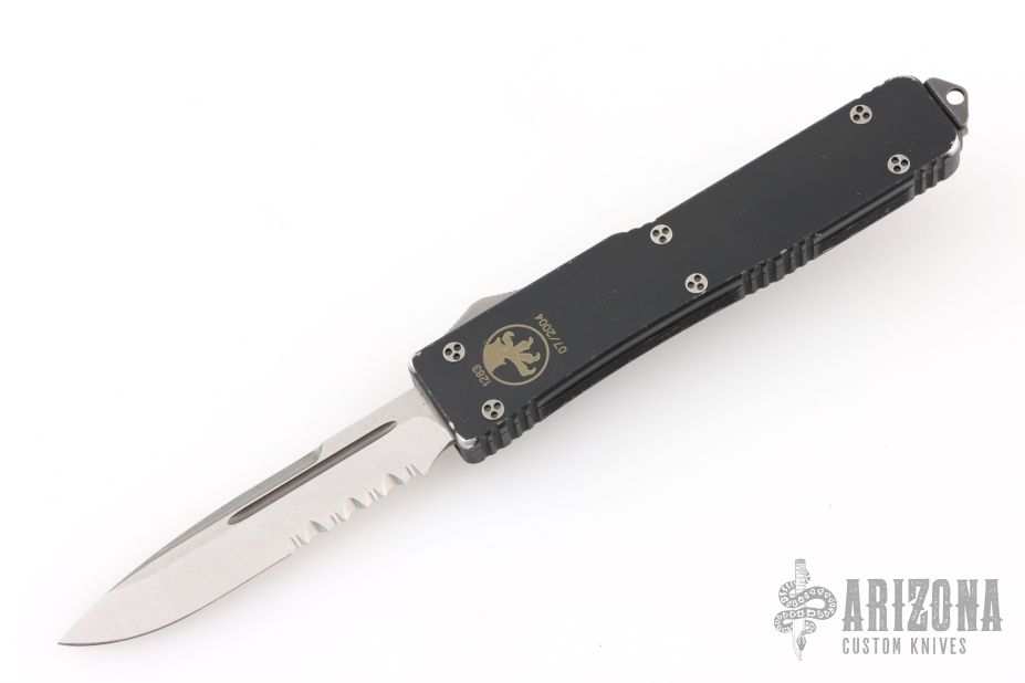This UTX-70 OTF automatic features a stonewashed partially serrated blade. Has a black aluminum frame with a black tip down pocket clip and lanyard hole. Has some scratches, wear on the frame, otherwise good user condition. #1283 and dated 07/2004