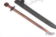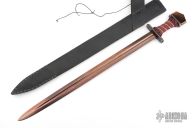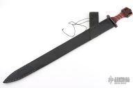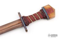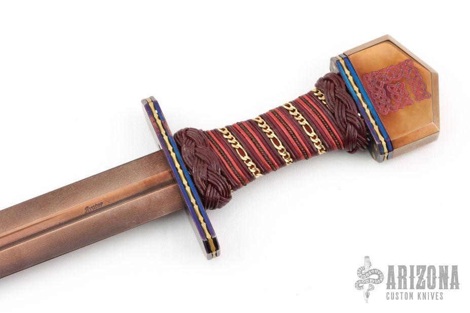 This Avatar Series Viking by Daniel Watson of Angel Sword features a blued Techno-Wootz Damascus double edged blade with fullers, .175" blade stock and 1.679" blade depth, hidden tang construction. The handle has a blued steel and fileworked brass guard, multi-color leather cord wrapped grip with gold chain spiral wrap, blued steel and fileworked brass spacers infront of the bronzed steel butt that has Celtic knot engraving. Comes with a black leather sheath with faux lizard skin overlay. Beautiful sword. Has a couple very light scratches, otherwise excellent condition.