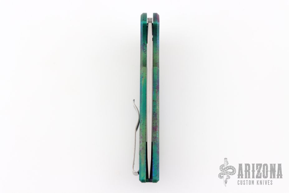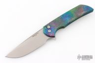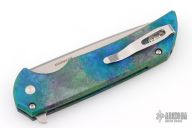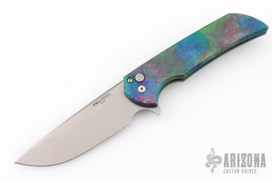 This Mordax by Pro-Tech is a Ferrum Forge design and features a stonewash finished drop point blade. The handle has a blue/purple/green aluminum frame with polished tip up titanium clip. Mother of pearl push button. Comes with original box, pouch, and papers. Excellent condition.