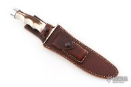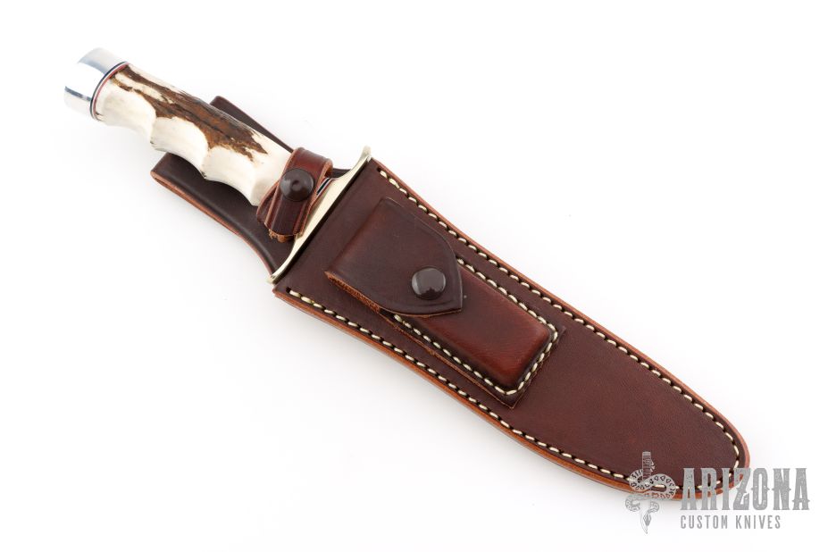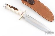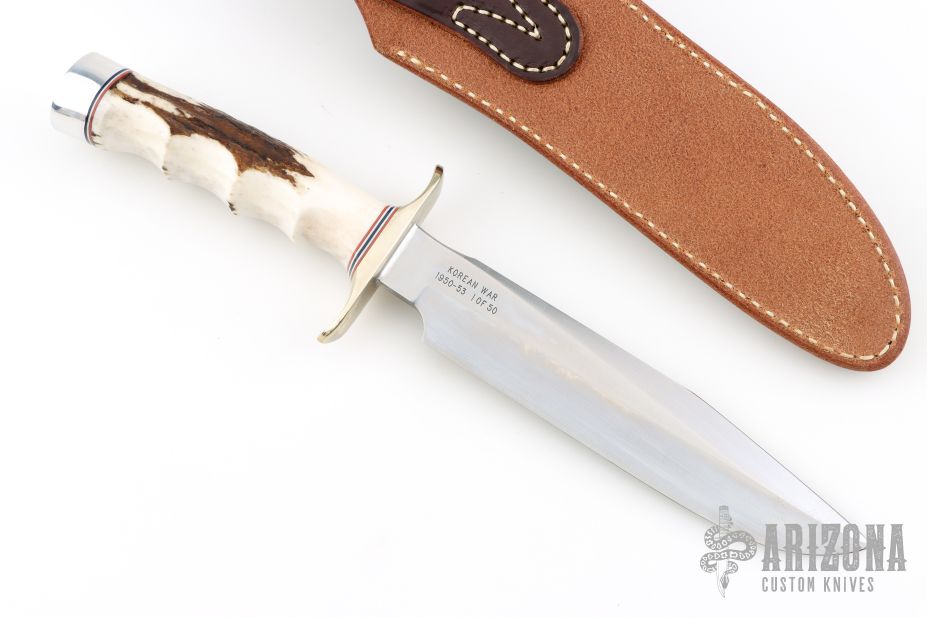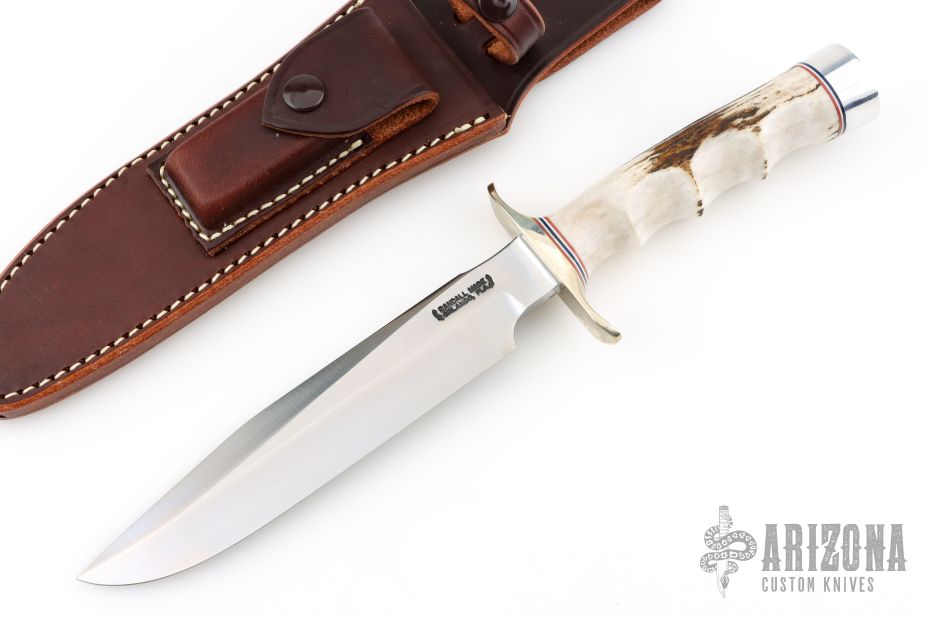 The Model 1-7 by Randall Made Knives. Nickel silver guard, finger groove stag grip, duralumin butt cap, red/white/blue spacers. Satin finished blade with sharpened top edge, .207" blade stock and 1.302" blade depth, hidden tang construction. Comes with a special brown leather sheath, embroidered zippered case and original paper wrapping. New from maker. Comes with COA
