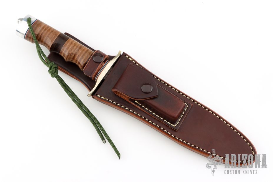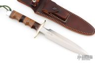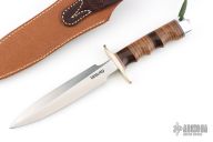 The Model 2-7 by Randall Made Knives is a heavily made dagger or dirk. Nickel silver guard, finger groove stacked leather grip, duralumin butt cap with tang nut and lanyard hole, red/white/blue spacers. Double edged satin finished blade, .208" blade stock and 1.252" blade depth, hidden tang construction. Comes with a special brown leather sheath, embroidered zippered case and original paper wrapping. New from maker.  Comes with COA.