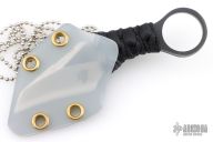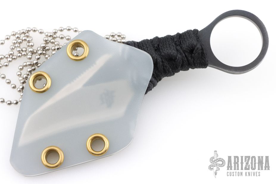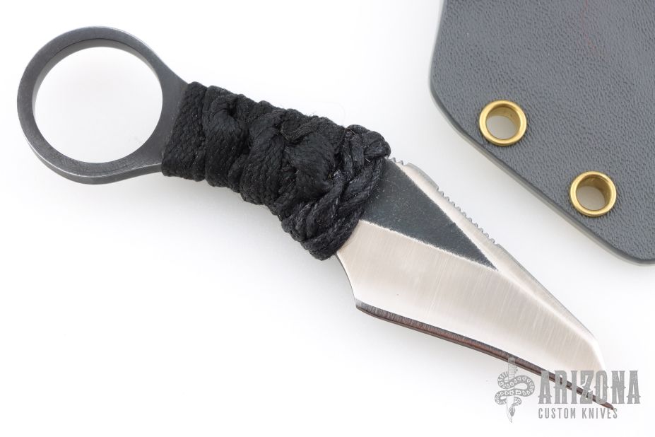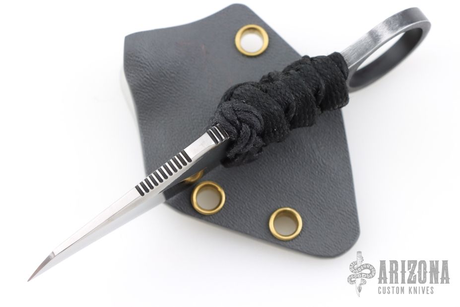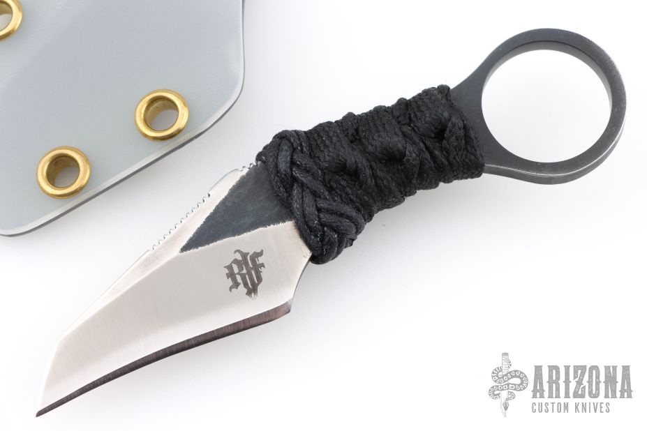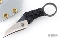 This Neck Knife by Ryan J. Forrest features a satin finished hawkbill blade with .179" blade thickness,1.074" blade depth, swedge, and notched thumbrests. The handle has Turks head knot, a cord-wrapped grip, and .875" finger hole. Comes in a Kydex sheath, with a ball chain, sticker, and Knife Dogs zipper case. New from maker!