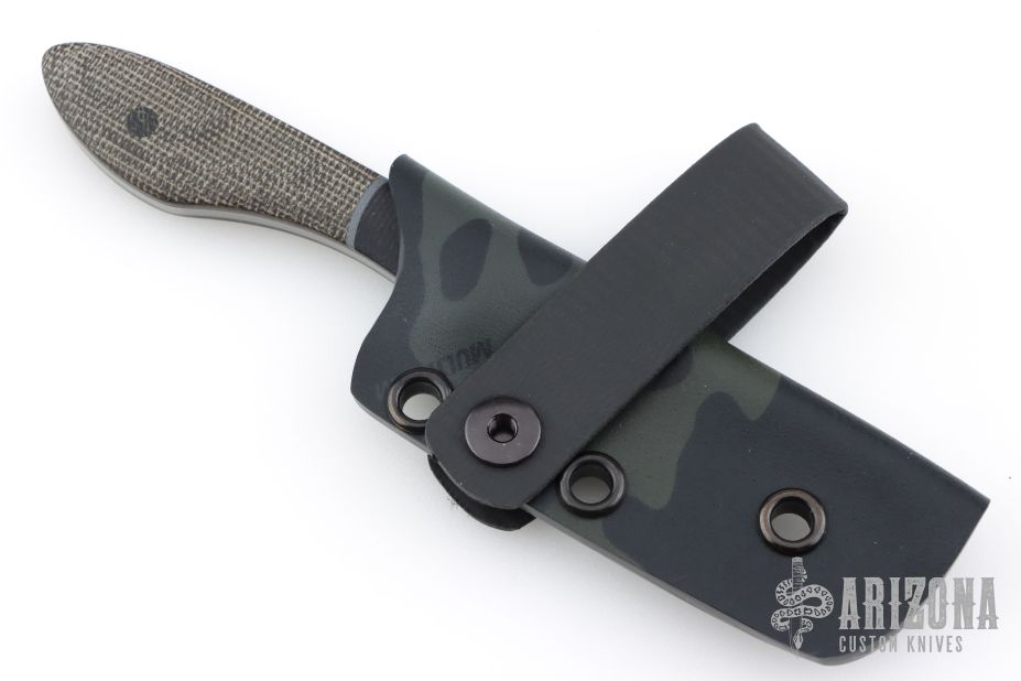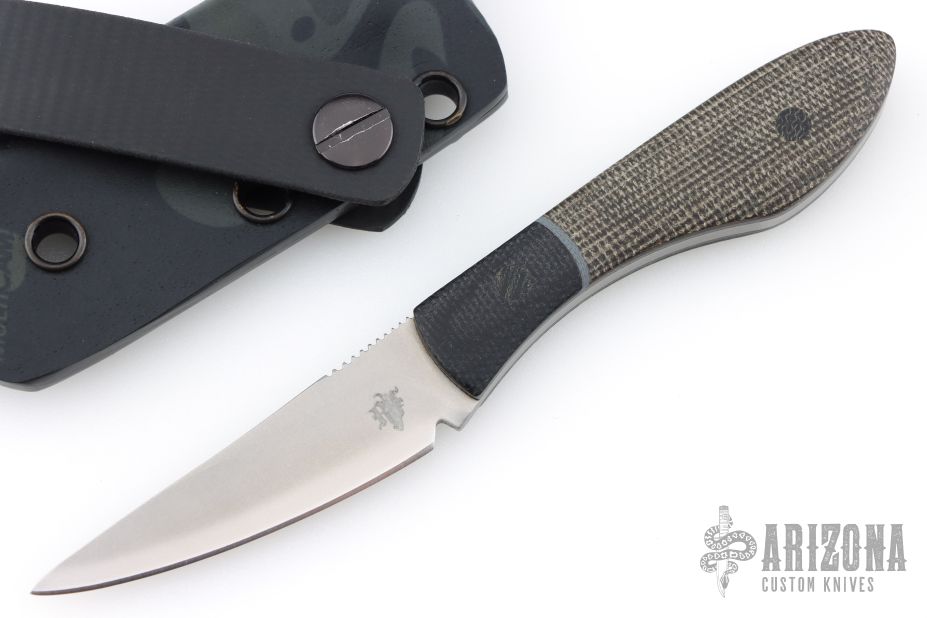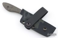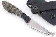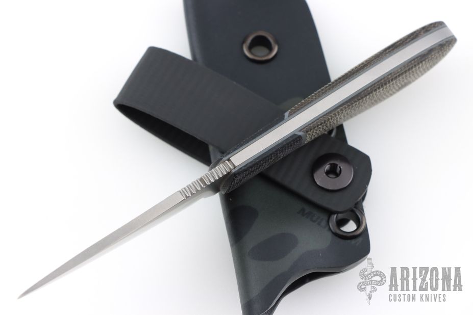 This B&T Utility Knife by Ryan J. Forrest features a bead blast finished drop point blade with .108" blade thickness, .652" blade depth, and notched thumbrest. The handle has black canvas micarta dovetail bolsters, with green micarta pin, green canvas micarta covers, black micarta pin, gray pinstripes and liners. Comes in a Kydex sheath, with horizontal belt loop, sticker, and Knife Dogs zipper case. New from maker!