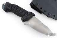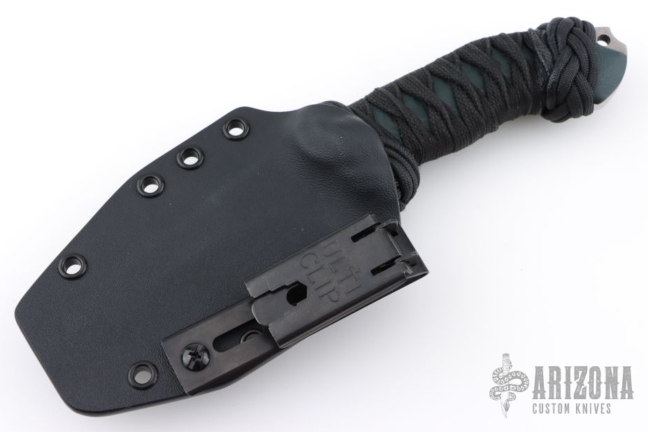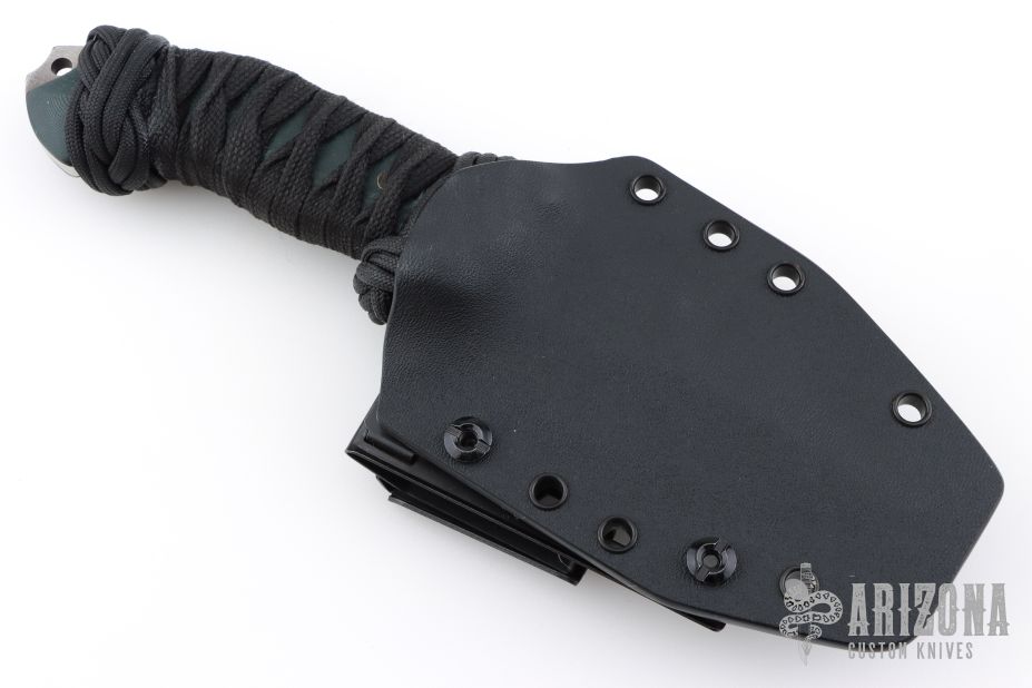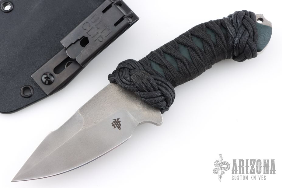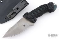 This Knife by Ryan J. Forrest features a bead blast finished clip point blade with .182" blade thickness, 1.646" blade depth, and swedge with top edge. The handle has Turks head knot, cord-wrapped grip, large choil, forest green g10 underlays, micarta pins, and exposed lanyard hole. Comes in a Kydex sheath, with Ulti-Clip, sticker, and Knife Dogs zipper case. New from maker!