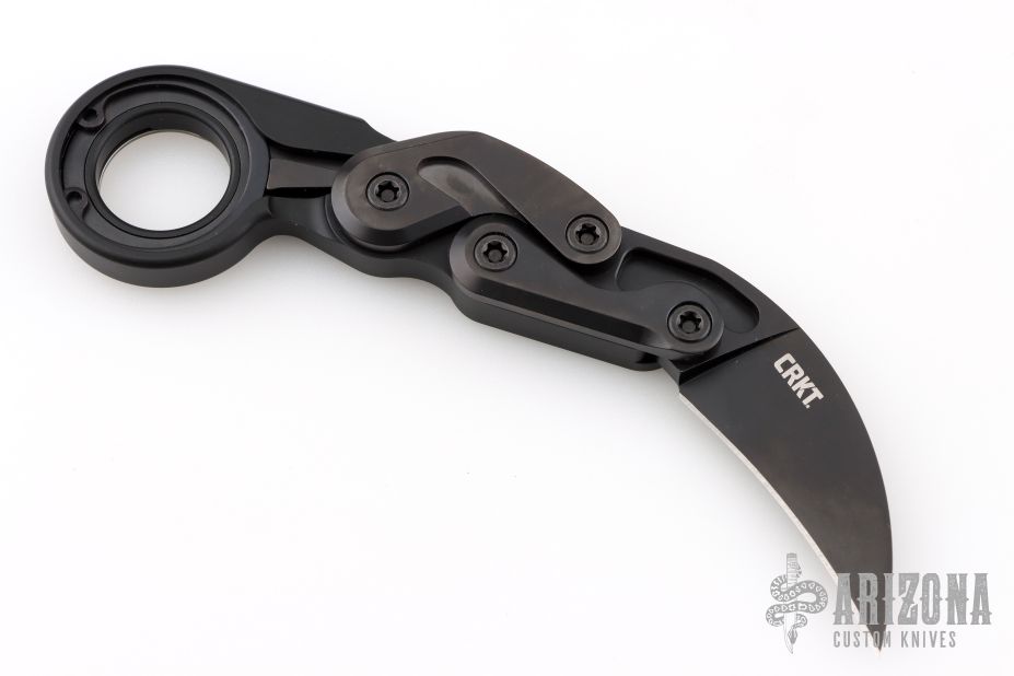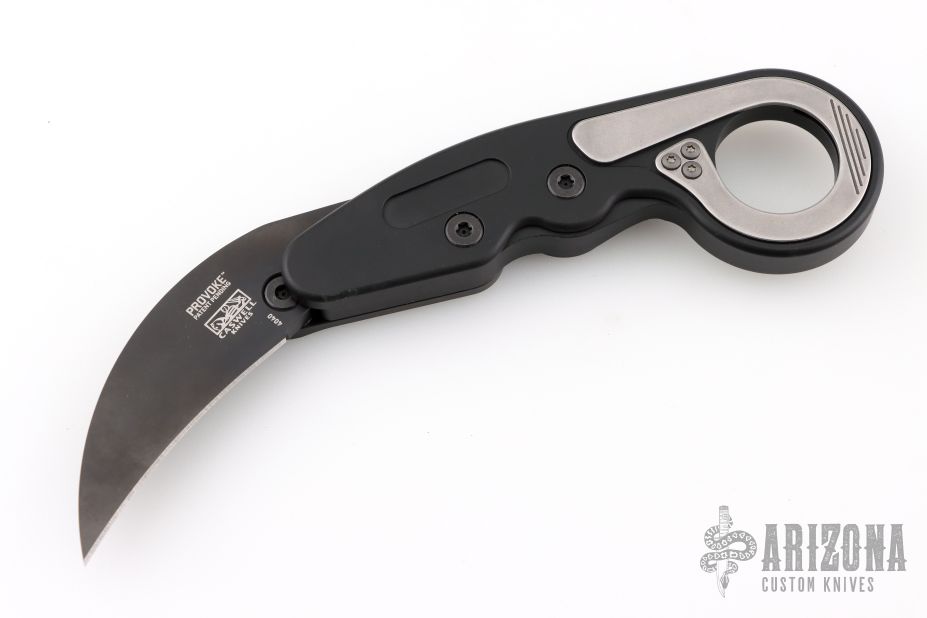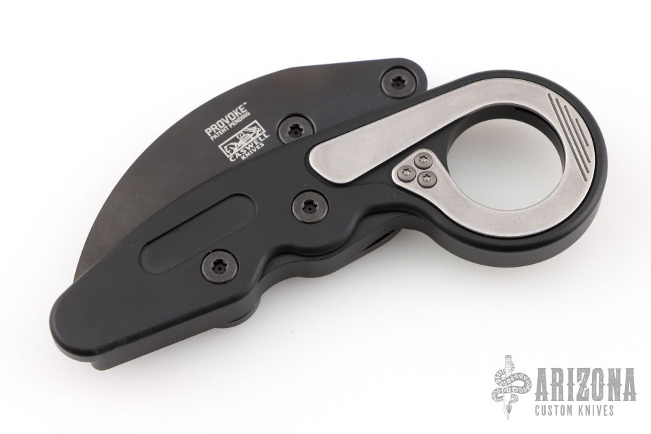 The CRKT Provoke is a Joe Caswell designed folding karambit that offers tactical ingenuity, with the first ever Kinematic forward opening blade. This unique feature allows for safe carry and rapid deployment without changing your grip on the handle. A low profile pocket clip rests flush with the handle while knife is in use for improved ergonomics. Experience tactical innovation with the CRKT Provoke Morphing Karambit from Joe Caswell. Features: Kinematic mechanism opens and locks the blade from the tip of the handle for rapid manual blade deployment. Hawkbill style blade made from tough and durable D2 steel in a black Ti nitride coating. Stainless steel pocket clip rests flush with the handle minimizing hot spots. Comes with original box and papers. Has a couple light scuffs, excellent condition otherwise.