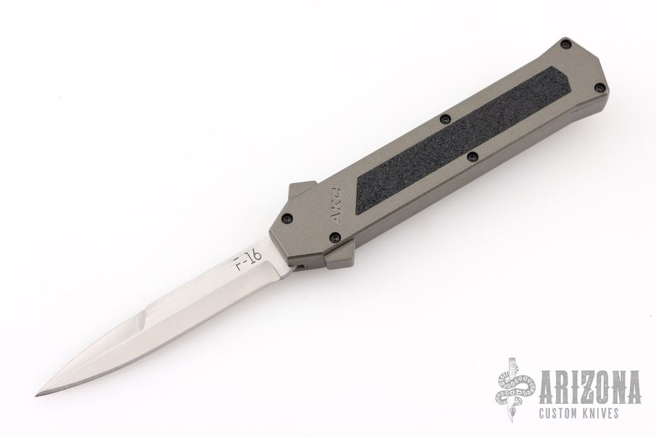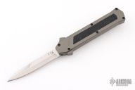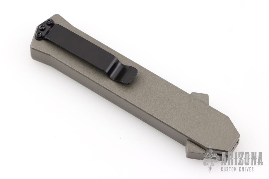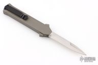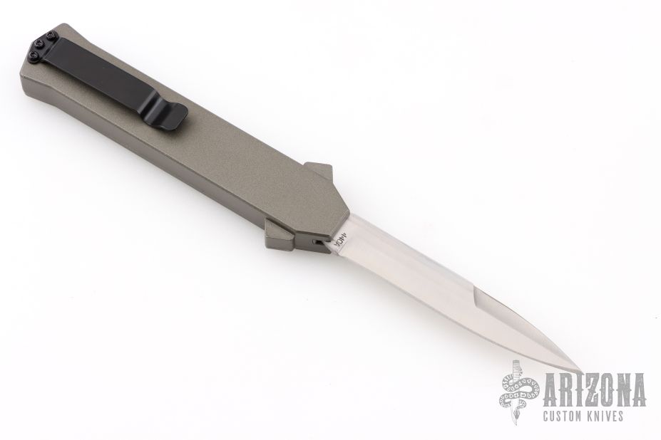 This OTF Auto by AKC Italy features a satin finished bayonet blade and anodized aluminum frame with a tip up black stainless steel clip. Gray body finish with non-slip inlay. Comes in a soft pouch. Has a couple light scuffs, excellent condition otherwise.