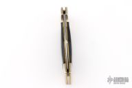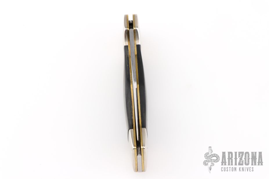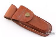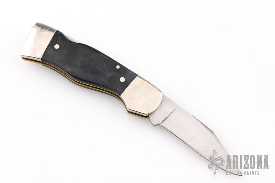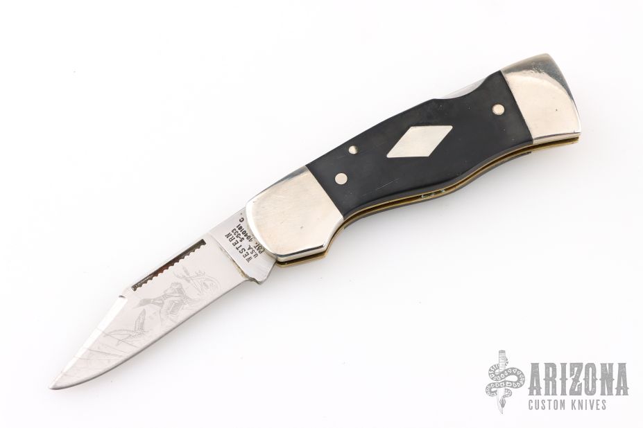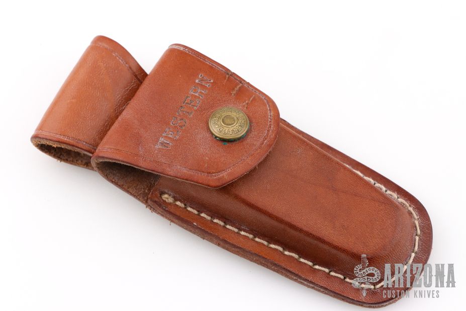 This lockback by Western Cutlery features a satin finished blade with etching and long pull nail nick. The handle has nickel silver bolsters, black Delrin scales, brass liners and a steel spring. Comes with a original brown leather belt sheath. Has been resharpened, has scuffs, has scratches throughout. Fair condition.