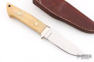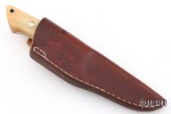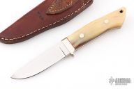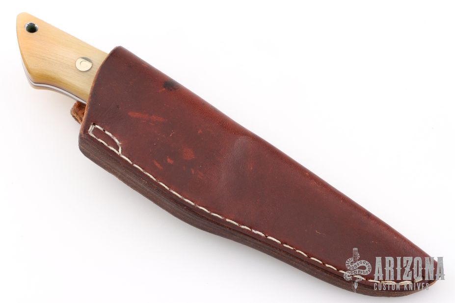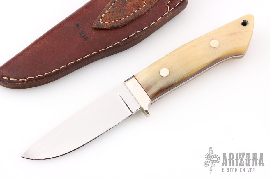This Hunter by Rick Genovese features a mirror polished blade with notched thumbrest, .182" blade thickness and 1.080" blade depth, full tapered tang construction. The handle has a nickel silver guard and sheeps horn scales with red liners and nickel silver pins, lanyard hole at the butt. Comes with brown leather sheath with #216 on the back, which matches the number on the blade. Has a couple of small chips in one of the scales, otherwise excellent condition.