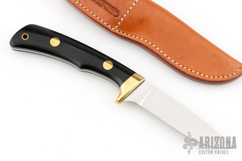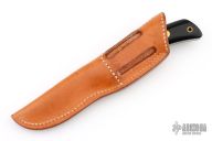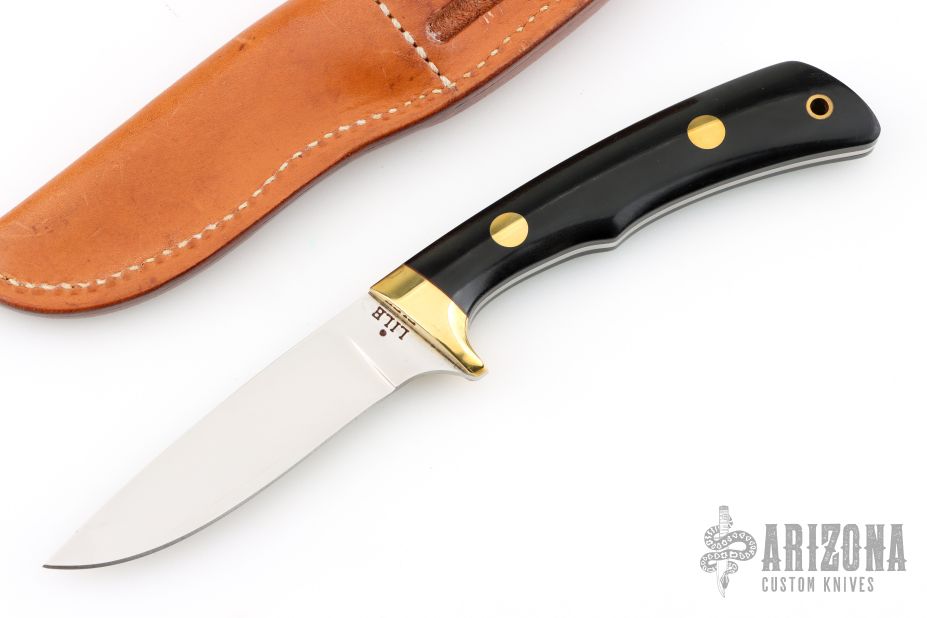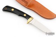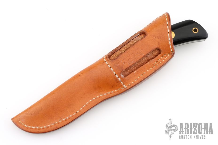 This fixed blade from by Lile Knives features a satin finish drop point blade with .113" blade stock and .884" blade depth. The handle is comprised of brass guard and pins with black linen micarta scales over full tang construction. Includes leather sheath with belt loop and a zippered case. Excellent condition.