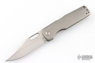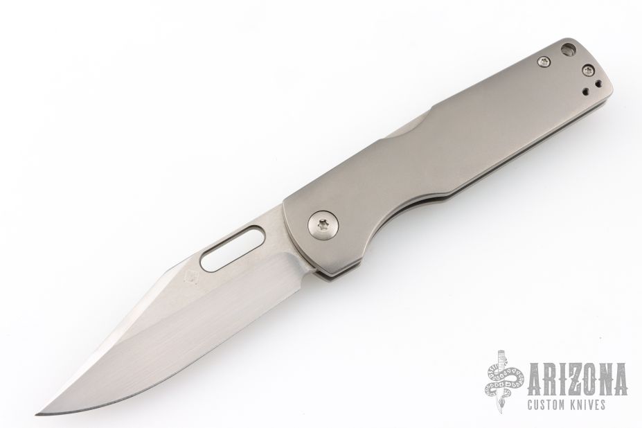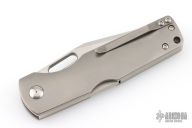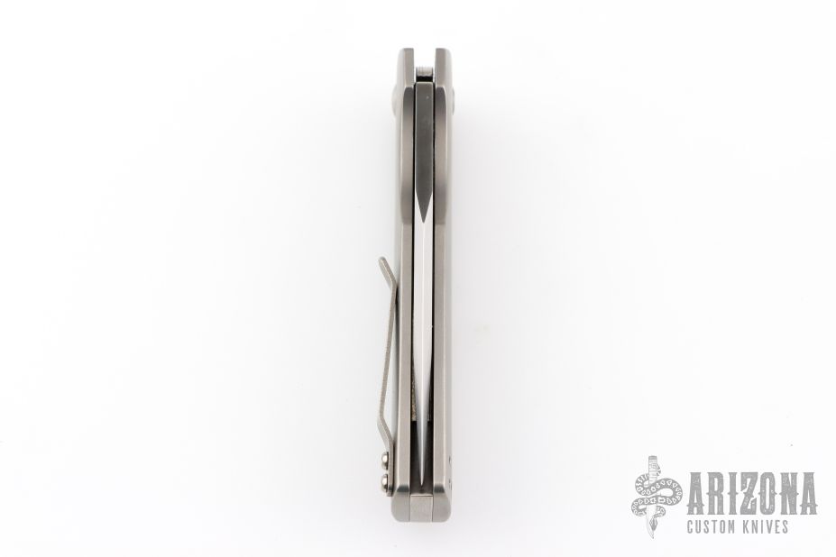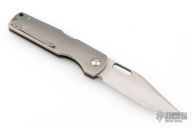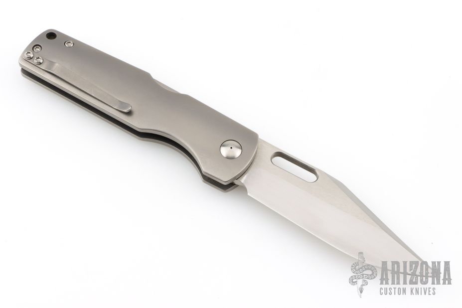 This Specialist lockback by Jim Burke features a hand rub satin finished blade with thumbhole. The handle has a blasted titanium frame with tip up titanium clip, orange peel finished titanium backspacer, matte finished stainless steel lockbar. Has a couple very light scratches, otherwise excellent condition. Comes with a leather pouch.