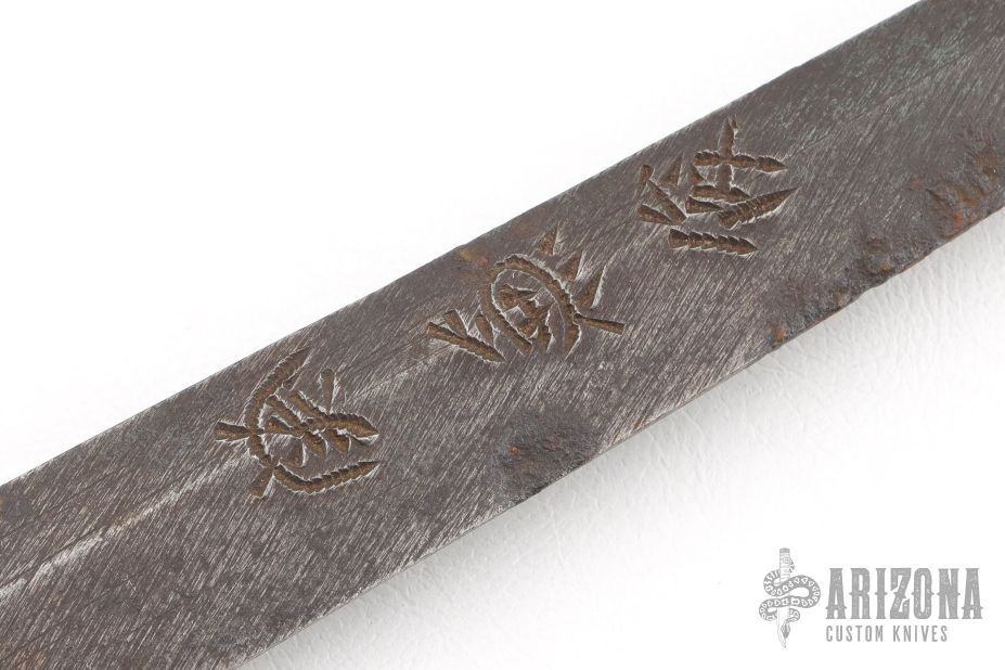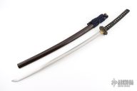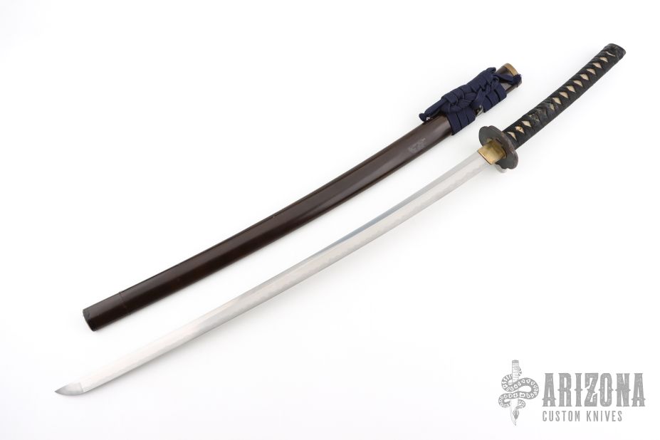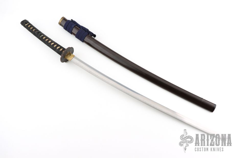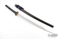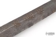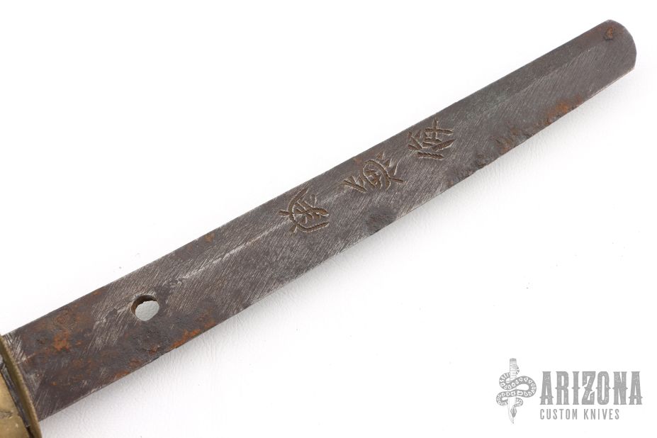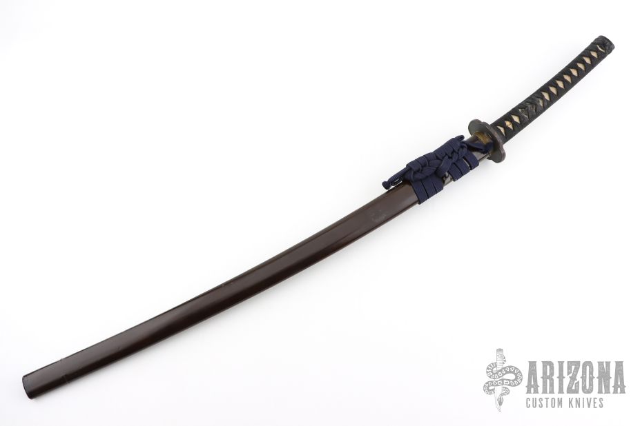 This is antique katana has a satin finished blade with a really nice hamon, .314" blade stock and 1.194" blade depth, hidden tang construction. The handle has a steel tsuba, brass seppas, brass habiki, black tuska-ito over white stingray skin and dragon menuikis. Has a black/maroon saya. Has some wear, some light scratches and patina, otherwise excellent condition for its age. The tang is signed, we will add pictures of that as well. Please let us know if you have any information on the sword maker.