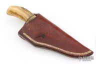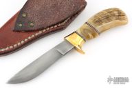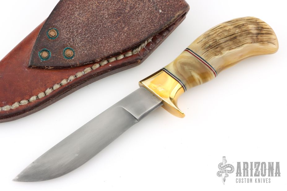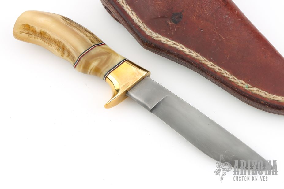 This Pronghorn by Butch Deveraux features a drop point blade with .254" blade stock and 1" blade depth, hidden tang construction. The handle has a brass guard with sheep horn grip and red/white/black spacers. Comes with a brown leather sheath. Has some light scratches, otherwise excellent condition.