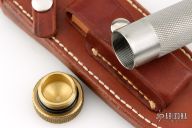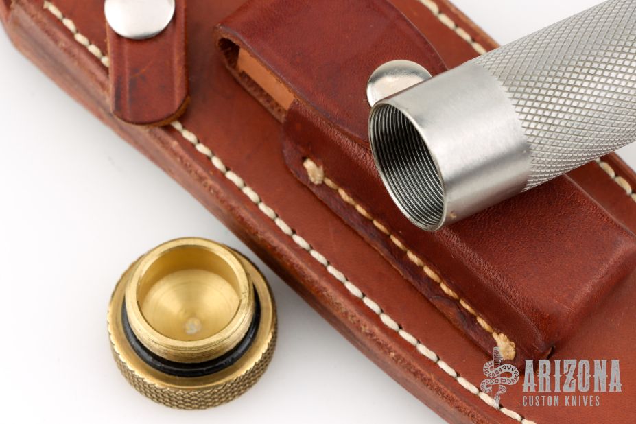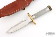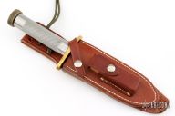 This Model 18-5.5 Attack Survival from Randall Made Knives has a spear point blade with sharpened top edge and sawteeth, .227" blade stock and 1.232" blade depth, hidden tang construction. The handle has a brass guard and knurled butt cap, knurled stainless steel handle. Comes with a brown leather sheath. Has some scratches, has been sharpened, good condition otheriwse.