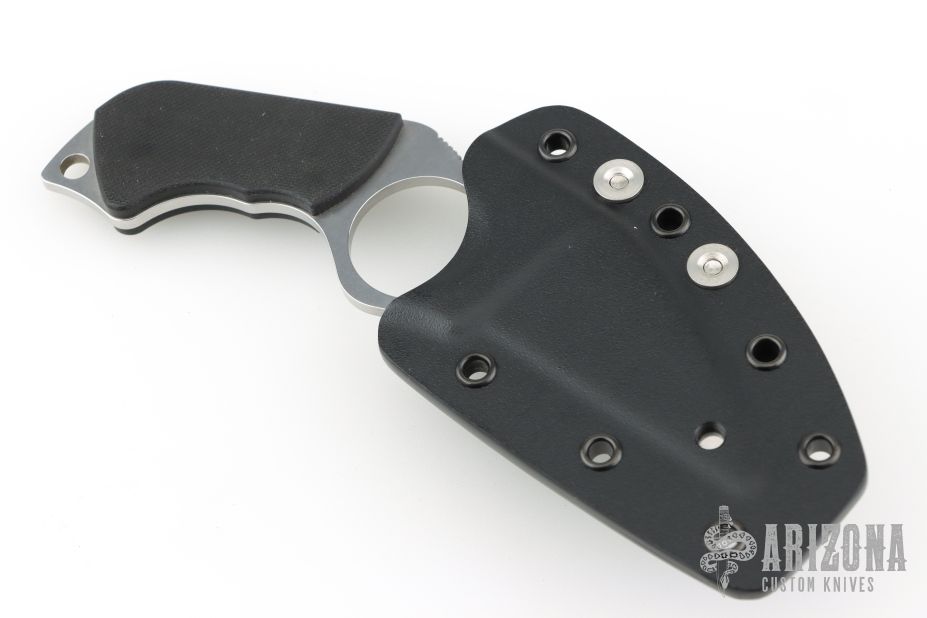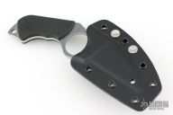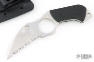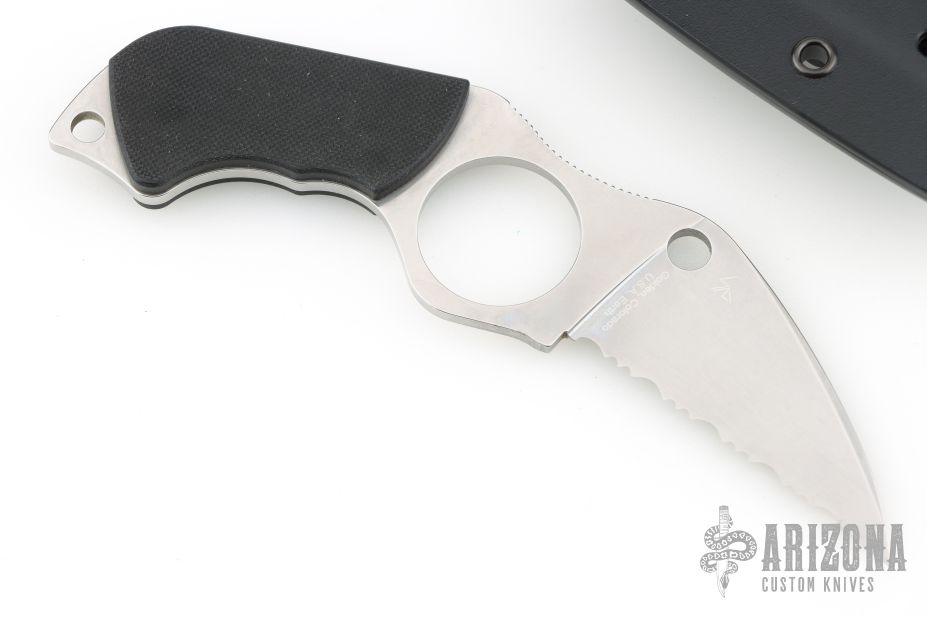 This Swick 5 by Spyderco features a tumble finished blade with serrations and notched thumbrest, .118" blade stock, 1.177" blade depth, and full tang construction. Finger hole is .905" in diameter, black g10 handle. Comes with original box, kydex sheath and papers. Also includes ball chain. Excellent condition.