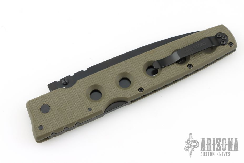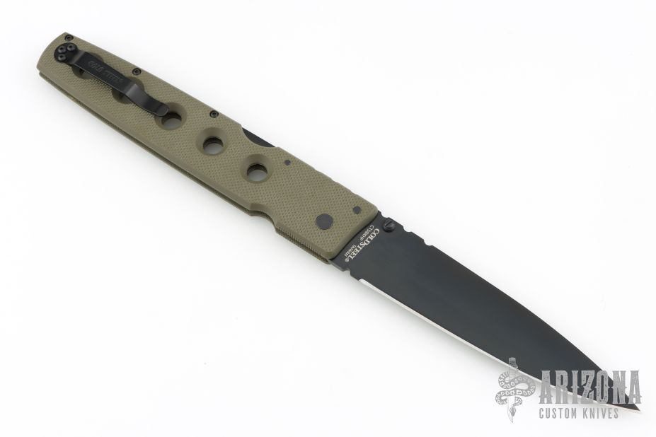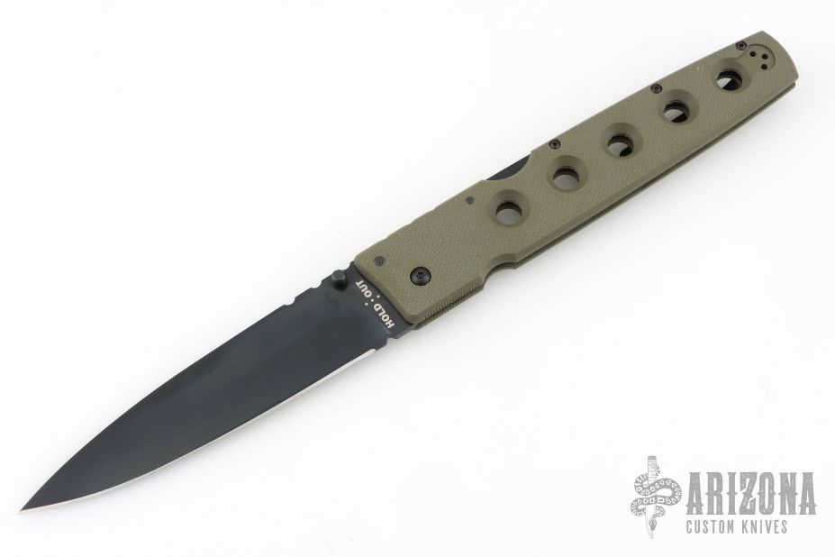 This Hold Out from Cold Steel features a black spear point blade with notched thumbrest and dual thumbstuds. The handle is comprised of od green G-10 scales with stainless steel lock back. Tip up reversible stainless steel pocket clip. Includes original box. Excellent condition.