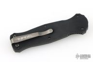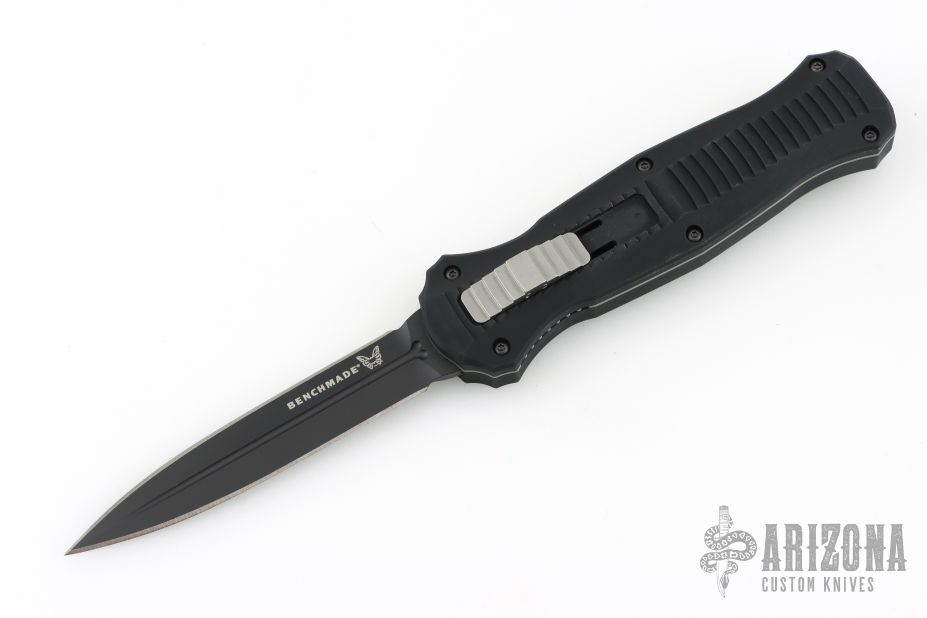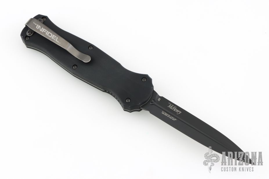 "Introducing an OTF like none-other.. The new Infidel® is rapidly making believers out of many a skeptic. Built for strength and reliability the patent pending double-action mechanics get it done over the long haul. Grab on and you will find the handle grip rock-solid with its patented machined in Presidio® style bi-directional tread pattern, and overall generous sizing for gloved hands. Intuitively pressure the release-slide forward and its spear-point edged steel fires and locks up with a unique three-point retention system with amazingly negligible blade play. Reverse the process and the blade retracts in a rapid blur of motion. The Benchmade Infidel is a special operator’s fantasy come true." Comes with original sheath. Excellent condition.