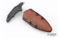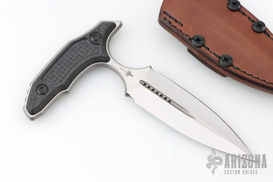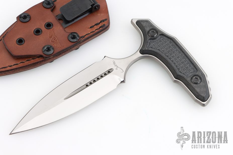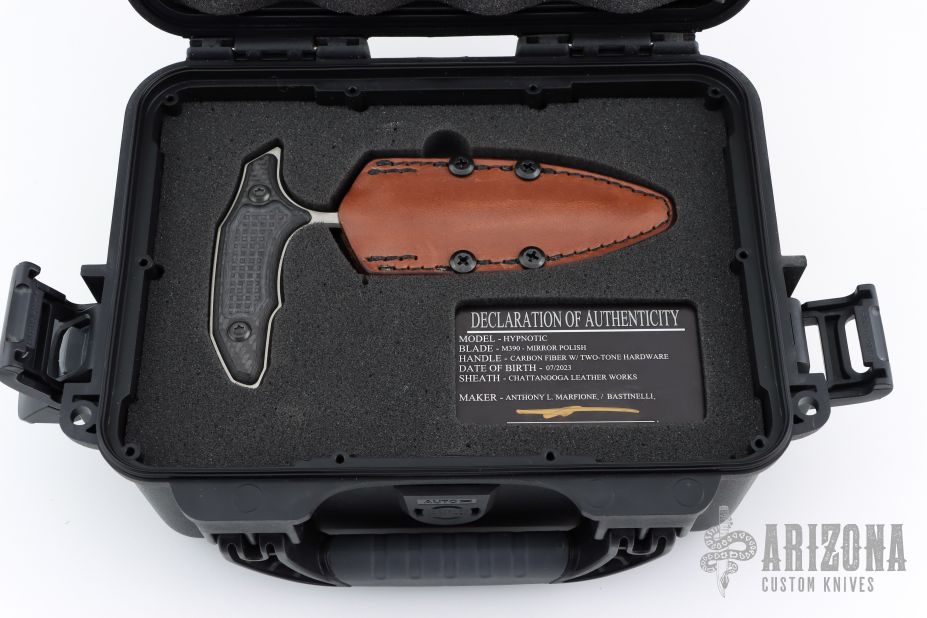 This Hypnotic Push dagger by Marfione Custom Knives and Bastinelli features a mirror polish finished double edged blade with fullers, .193" blade stock and 1.238" blade depth, full tang construction. The handle has frag milled carbon fiber scales. Comes with a Chattanooga Leatherworks brown leather sheath, hard case, COA dated 7/2023. Excellent condition.