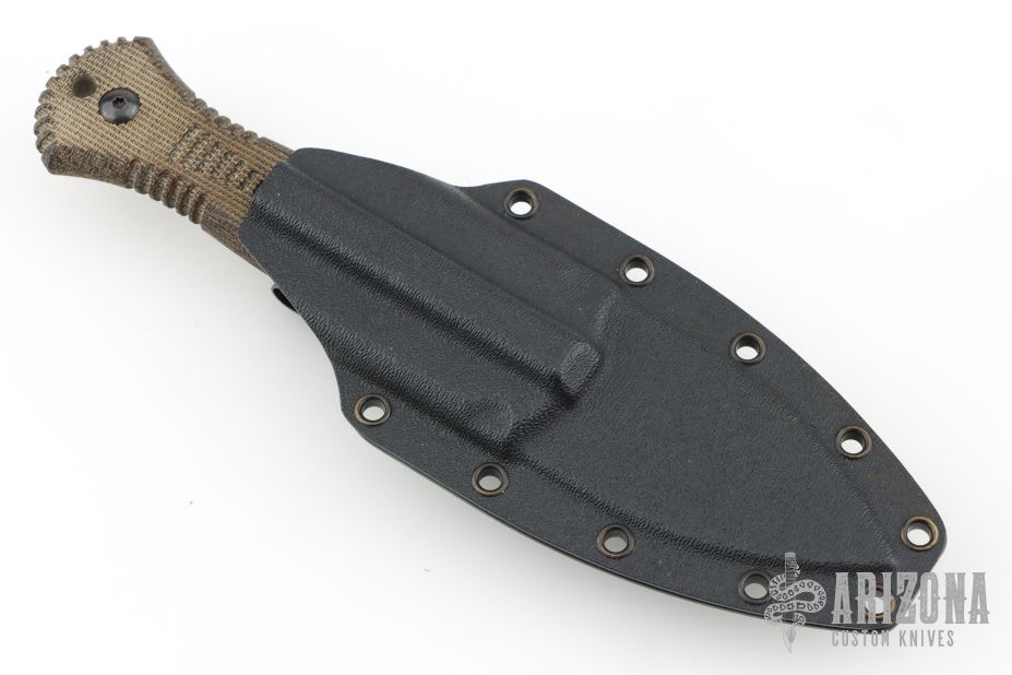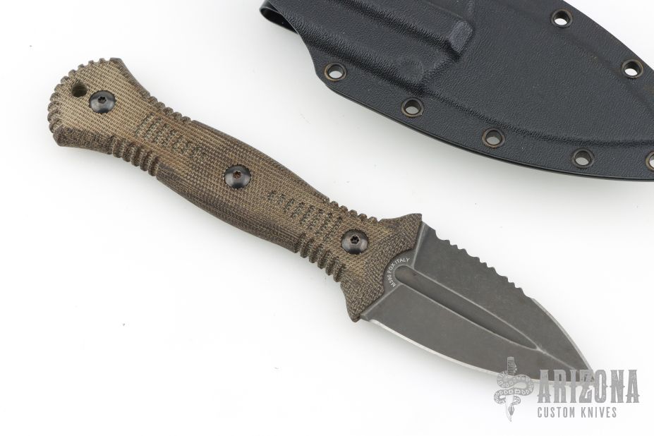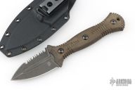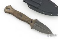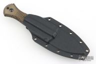 The Telum by Bastinelli Knives features a stonewashed double edge blade with partial serrations and fullers, mortise tang construction, .112" blade stock and 1.354" blade depth.  The handle features green canvas micarta scales. Includes a kydex sheath with a Tracker Dan clip and original hard case. Excellent condition.