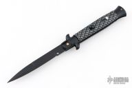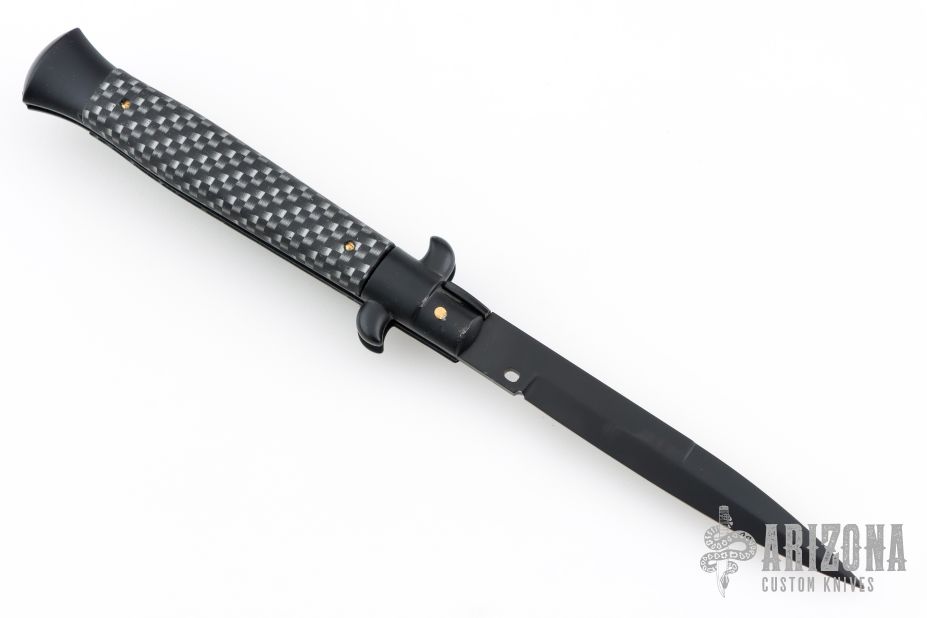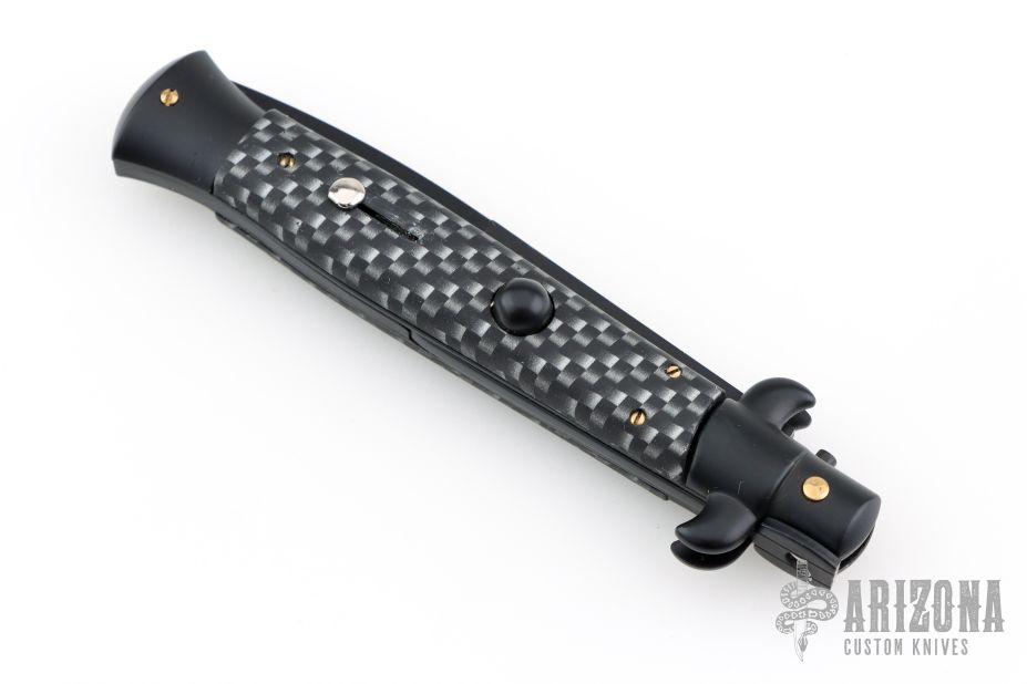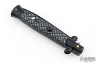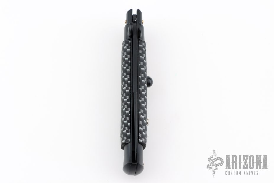 This Swivel Bolster features a black flat ground blade. The handle has black stainless bolsters, front and rear, carbon fiber patterned rubber scales, brass liners, stainless spring. Has a couple light scuffs, excellent condition.