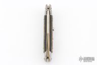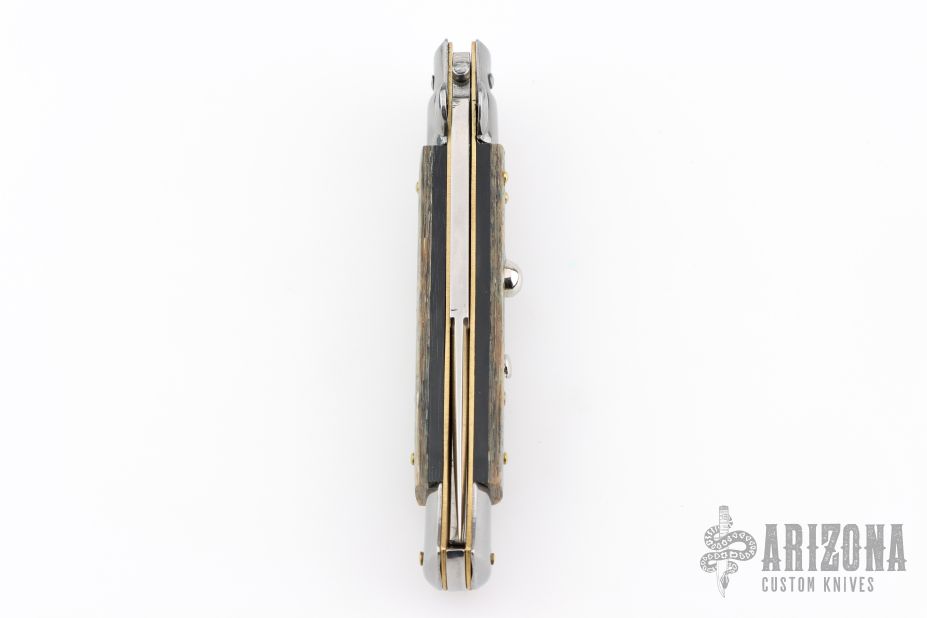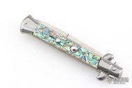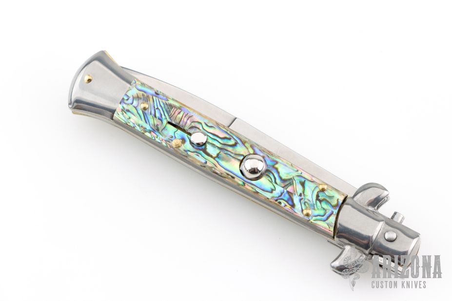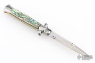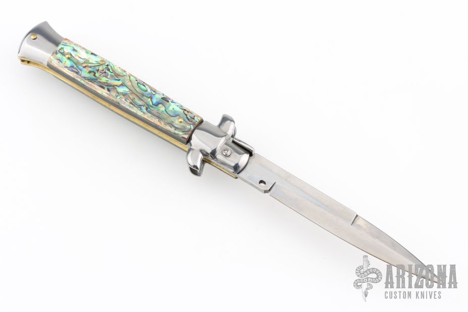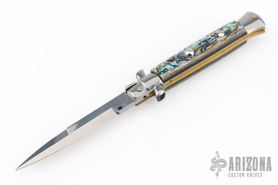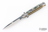 This 9" Swivel Bolster by Frank Beltrame features a polished bayonet ground blade with false top edge. The handle has stainless steel bolsters, front and rear, abalone scales, brass liners, stainless spring. Excellent condition.