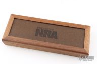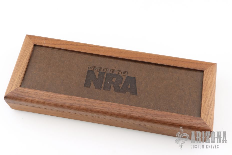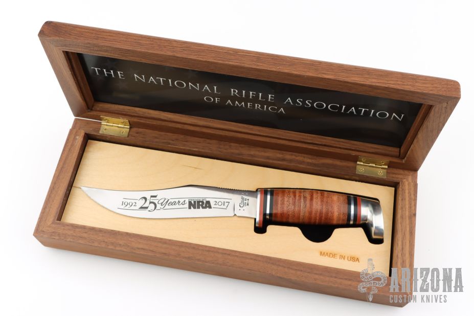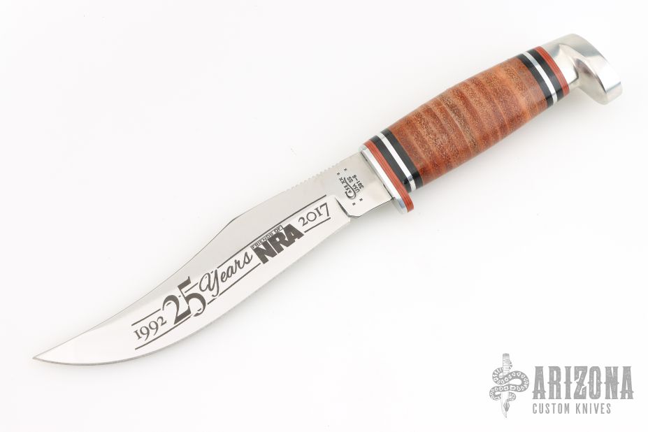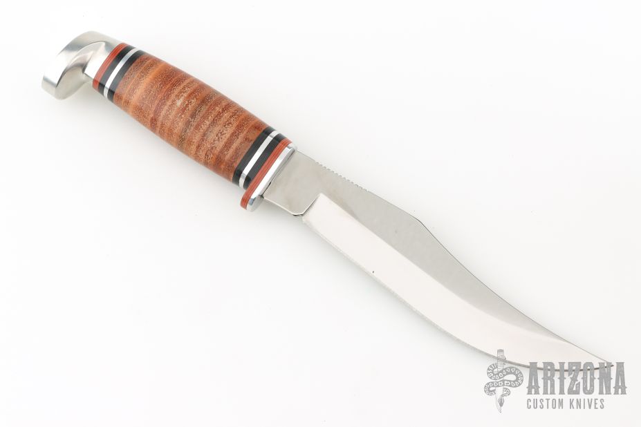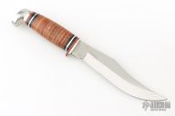 This Hunter from Case Knives features a mirror polished blade with a notched thumbrest, .103" blade stock and 1.172" blade depth, hidden tang construction. The handle has an aluminum guard, aluminum pommel with a stacked leather grip, red/black/aluminum spacers. Includes a magnetic wooden presentation box. Has a spot on the back of the blade from the magnet, otherwise excellent condition.