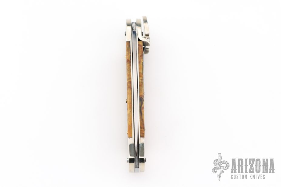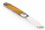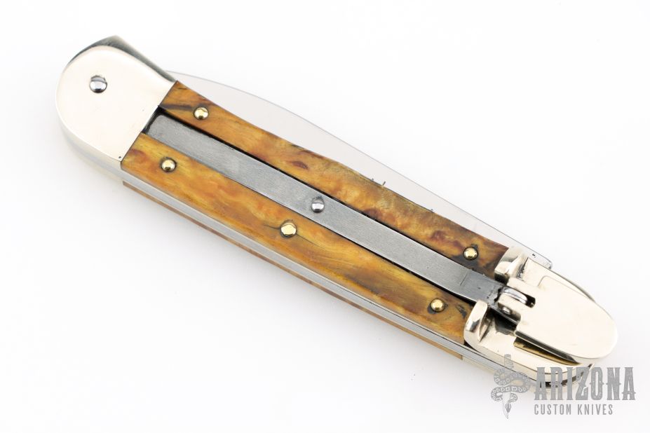 This leverlock auto by Hubertus features a tumble polished blade. The handle has nickel silver double bolsters, wood scales, nickel silver liners and brass pins. Comes with original box, papers, and cloth. New condition!
