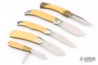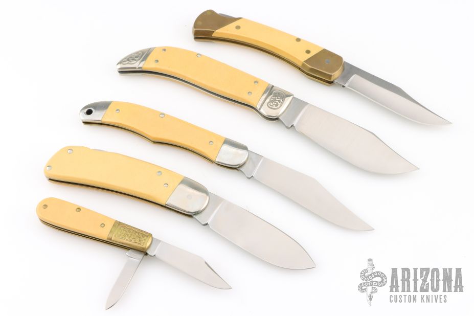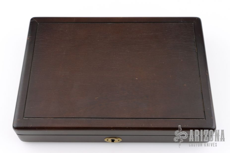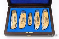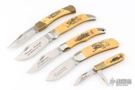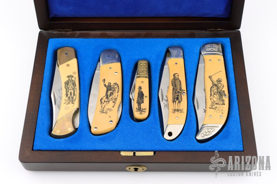 This knife set by Schrade Cutlery was made to commemorate our 1st 3rd 7th 16th 26th Presidents. They feature a satin finished blades with nail nicks. The handles have brass and nickel silver bolsters and liners, yellow paper micarta covers with scrimshaw, stainless springs. All come in a wooden presentation box. Excellent condition. All #456