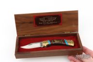 This Buck Model 112 knife Customized by David Yellowhorse is a lock back with brass bolsters, ironwood, turquoise, jasper and brass spacers. Satin finished blade. Strong lock up. Excellent condition. Comes with original wooden box. The lid has been repaired and is off center.