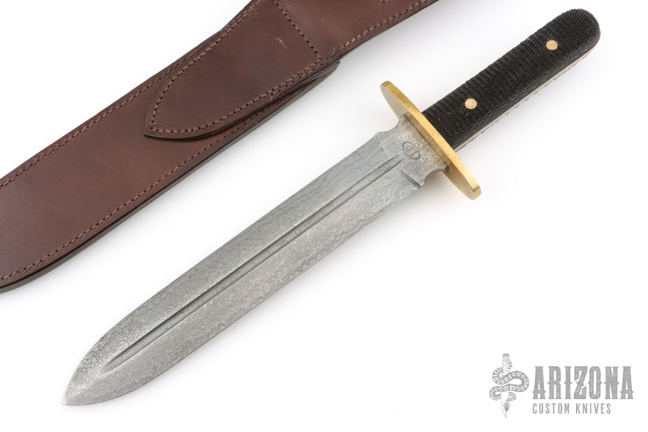 This Roosevelt & Drake camp knife features a double-edged spear point blade forged from true pattern-welded Damascus steel. The design traces back to a pattern shown in the 1925 Manton Centenary catalogue and has been reproduced using traditional forging methods rather than modern decorative processes.