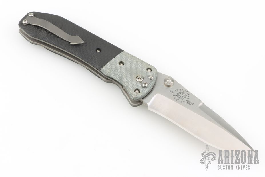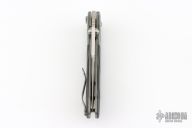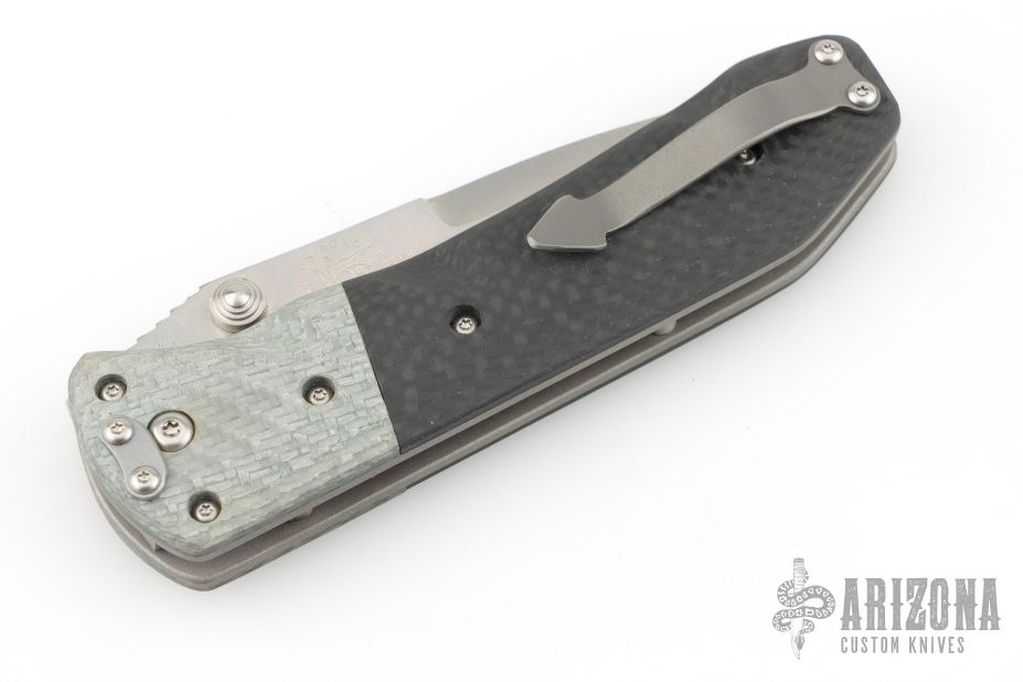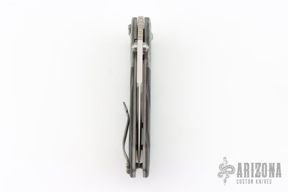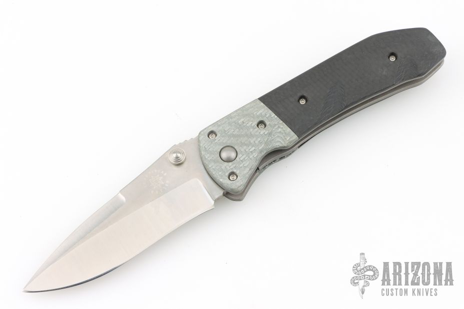 This Whiplash by Brad Duncan features a spear point two-tone blade with false top edge, dual thumbstuds and notched thumb ramp. The handle has silver twill bolsters, bead blasted carbon fiber scales, bead blasted titanium tip up/down clip. Nice action, detent, lockup and blade seating. Has a couple light scuffs, otherwise excellent condition.