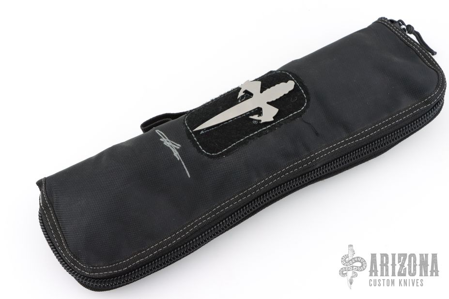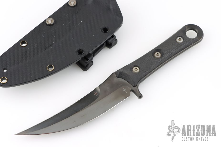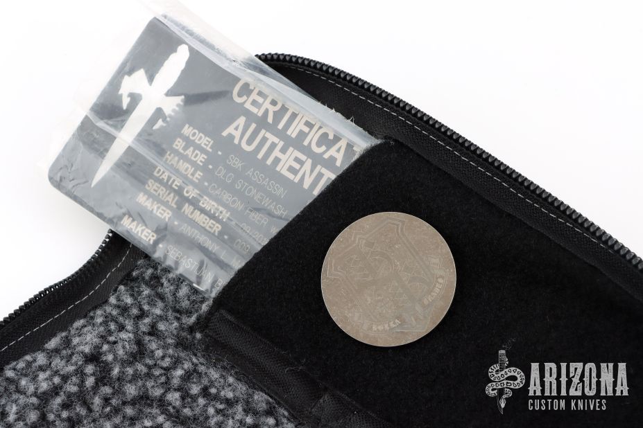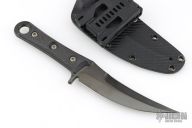 This SBK Assassin from Borka Blades and Marione Custom Knives features an upswept blade with .195" blade stock and 1.337" blade depth. The bronze hardware. The handle is comprised of black carbon fiber scales and full tang construction. Includes kydex sheath, zippered case and certificate of authenticity dated 09/2016 and #009. Excellent condition.